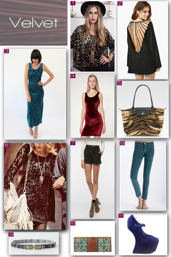 Slideshow Trend Watch: Velvet September 26, 2012 PiperlimeMINKPINK Animal Kingdom velvet top in multi $75Buy at Singer22For Love & Lemons El Diablo blouse $198Buy at Nasty Gal Crushed velvet turquoise maxi dress $58Buy at Yo VintageVelvet tank pencil dress in Burgundy $42Buy at American ApparelLongchamp Le Pliage Tigre velvet cotton medium shoulder tote $210Buy at Saks Gyspy Junkies Noir Velvet Tunic $88Buy at Ladakh Gang Velvet Corduroy Short $89Buy at Urban OutfittersThe Breathless low rise skinny leg jean in deep teal velvet $198Buy at Mih JeansSpotlights Velvet belt $128Buy at AnthropologieVintage Revival frame clutch $75BuyJeffrey Campbell Night Walk in royal blue velvet $169.95Buy at Solestruck of Swathe yourself in velvet this fall for a royal trend. Filed under Trend Watch Share Share on Facebook Share on Twitter Share on LinkedIn Share on Pinterest Share via Email Share on Reddit Show Comments