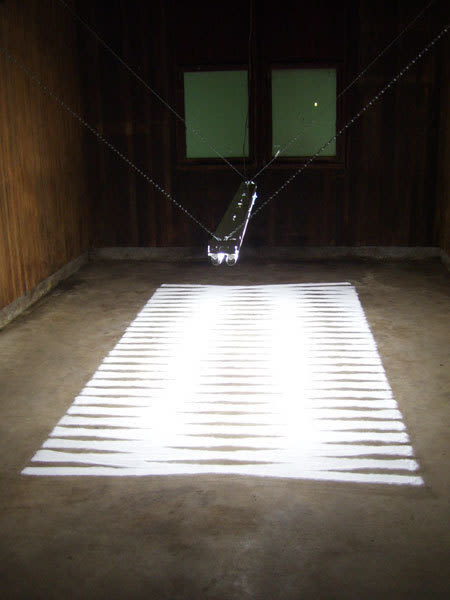 The experience of seeing Daniel Wallace’s Ghost Vibes at Jill Campioli’s new garage exhibition space can’t be separated from its context. With the pulsing beat of the largest Native American drum I’ve ever seen ringing in my ears, I head down a dark driveway toward the bright white light at the end. The movement down the driveway provides a clearing of mind and sense that culminates in first view of a pure, minimalist installation. In a small garage with un...
