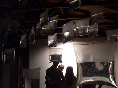 She reached out to the Ziploc® bag full of water and…touched it (!?!?). And it swung, and the lights played in the water inside, but it did not bump any of the other two dozen or so bags suspended at various heights 1/4 of the way into the garage that is Appendix Project Space. And she moved further into the space, this time ducking under yet another water-filled bag, steering for the three chunks of cantaloupe affixed to the back wall. A half ...