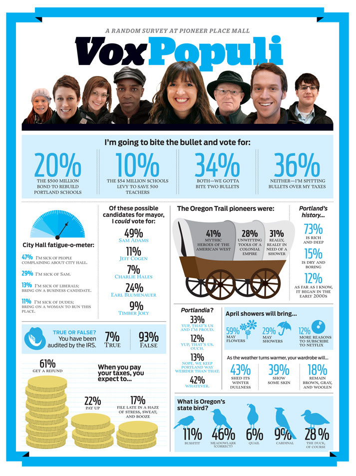 Vox Populi Vox Populi: A Random Survey at Pioneer Place Mall We took a random survey at Pioneer Place Mall and asked local Portlanders a myriad of questions. March 17, 2011 Published in the April 2011 issue of Portland Monthly Filed under Vox Populi, Survey Share Share on Facebook Share on Twitter Share on LinkedIn Share on Pinterest Share via Email Share on Reddit Show Comments