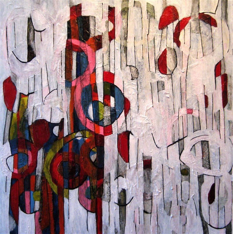 Julie Simpson’s mixed-media "stitch and repeat" technique leaves the viewer with the sense that the shapes are simultaneously disjointed, and interwoven. Fracture, 24″ × 24″, mixed media