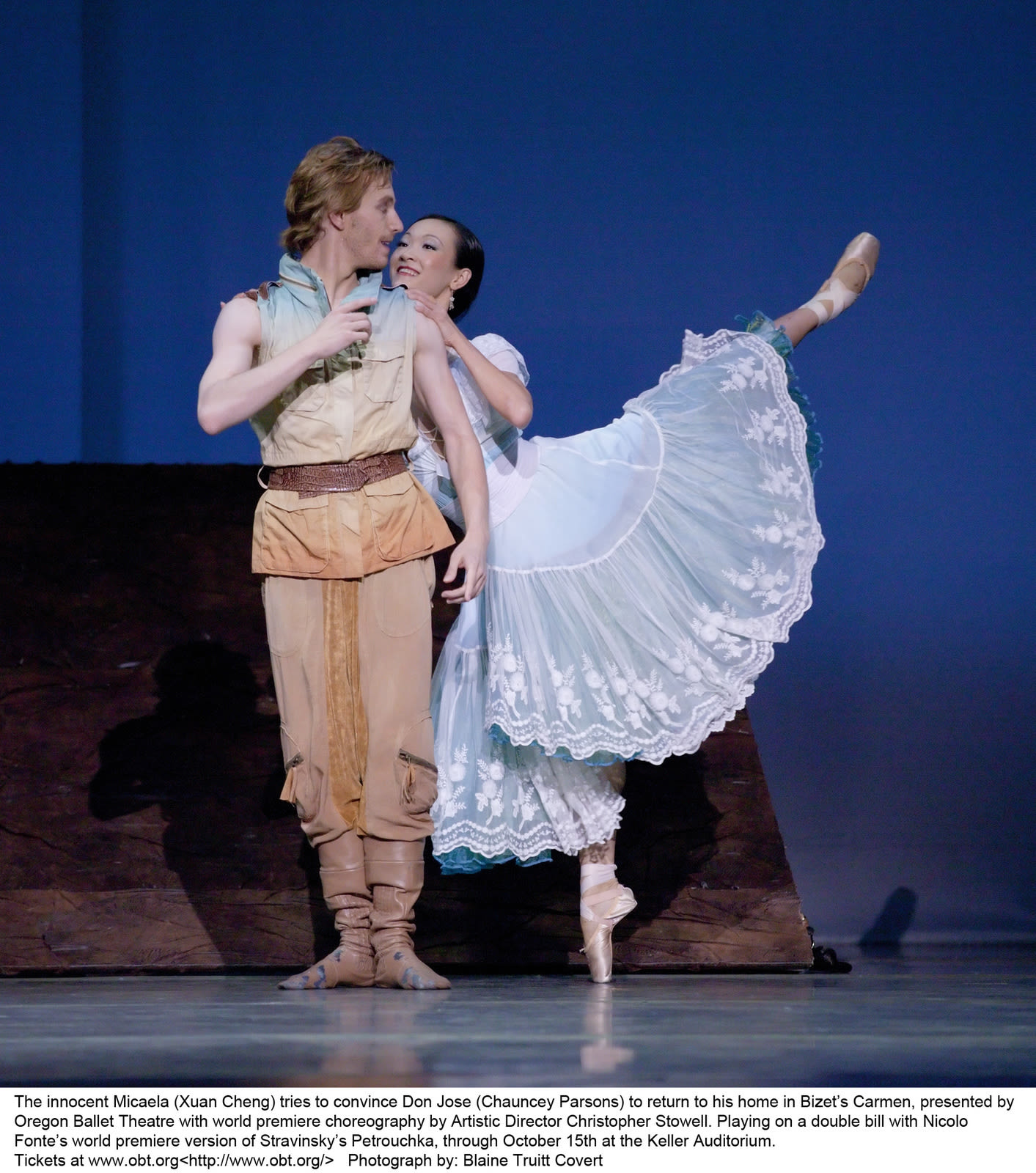 Oregon Ballet Theatre’s latest production, a double-header of Bizet’s Carmen and Stravinsky’s Petrouchka, premiered this weekend and continues next. Carmen is staged with a classic "maidens and woodsmen" look, while Petrouchka seems to build from the bold explorations of last season’s Stravinsky Project, with a minimalist, dark aesthetic