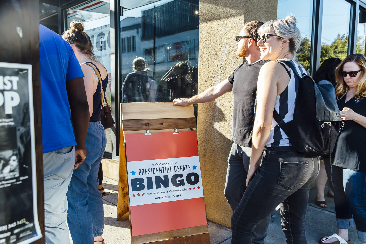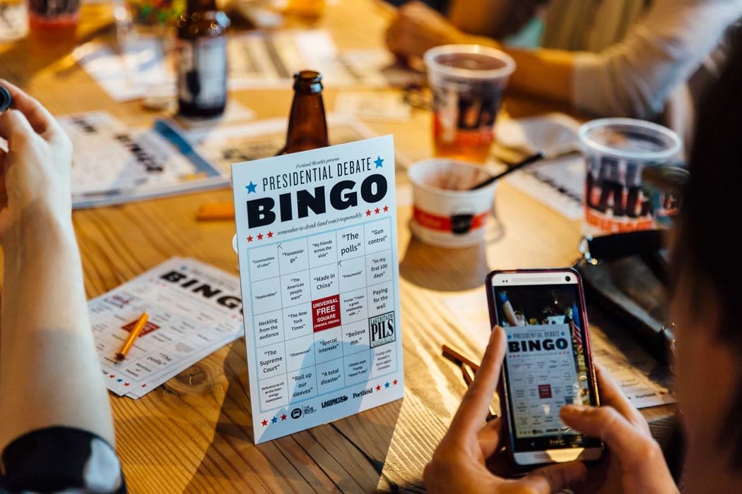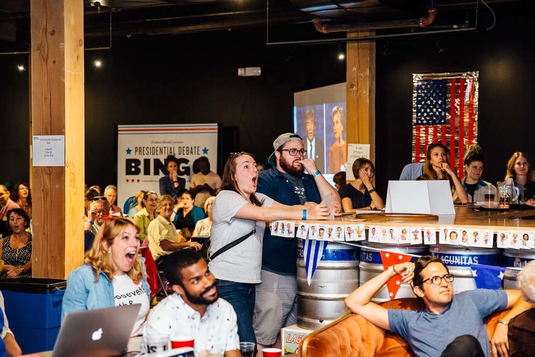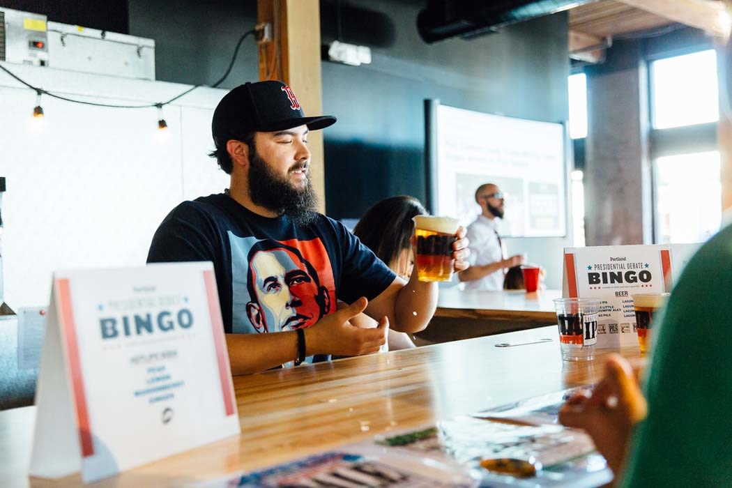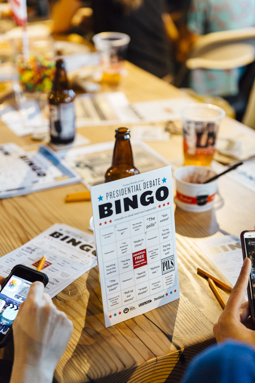 On September 26, Portlanders showed their civic enthusiasm at PoMo's Presidential Debate Bingo! More than 200 guests flocked to Lagunitas Community Room to watch Clinton and Trump face-off while tracking meme-worthy transgressions on our custom Bingo cards. Thanks to HOTLips Pizza, Salt & Straw Ice Cream, Lagunitas Brewing, and The Bus Project for making this event possible.