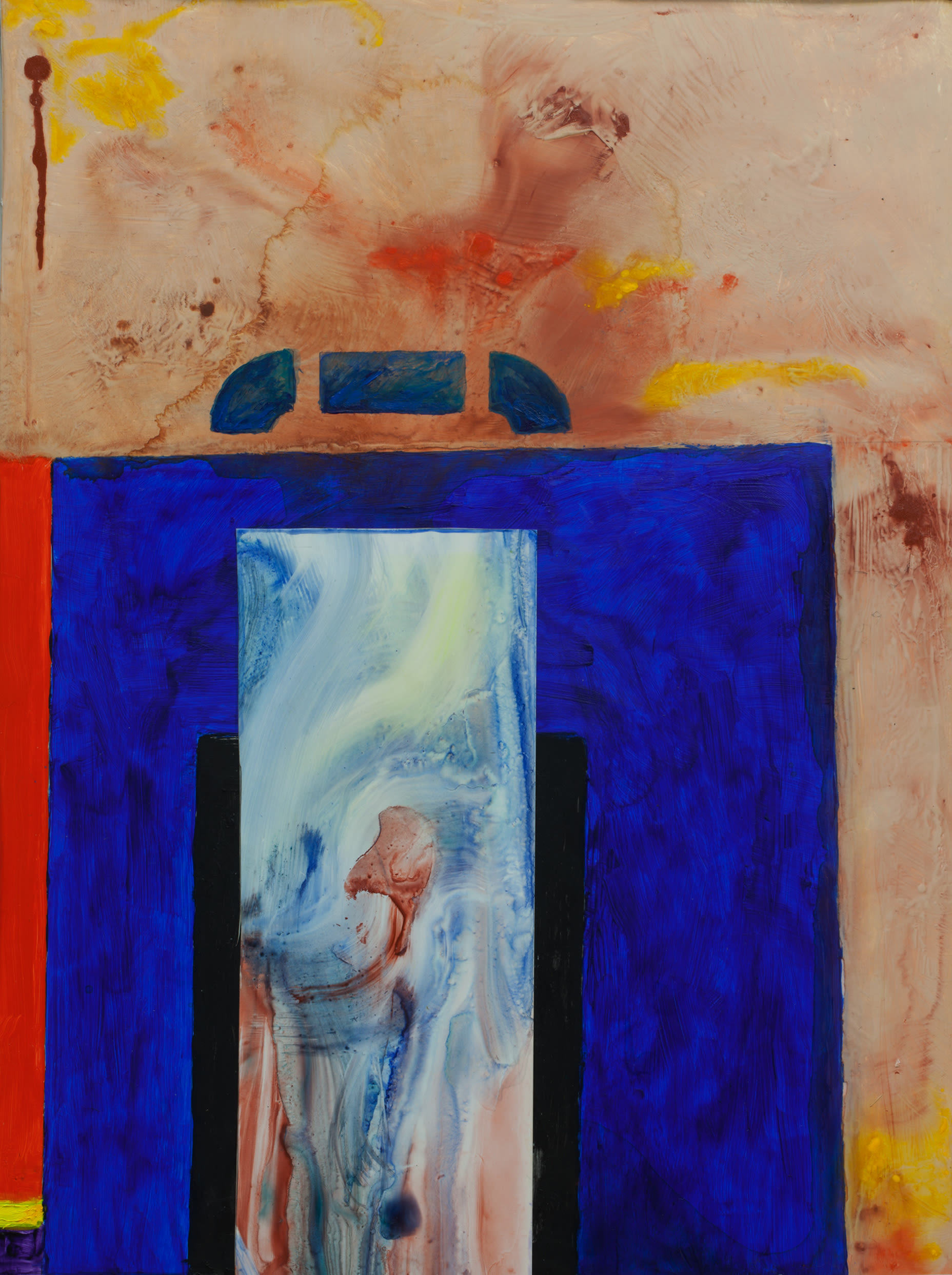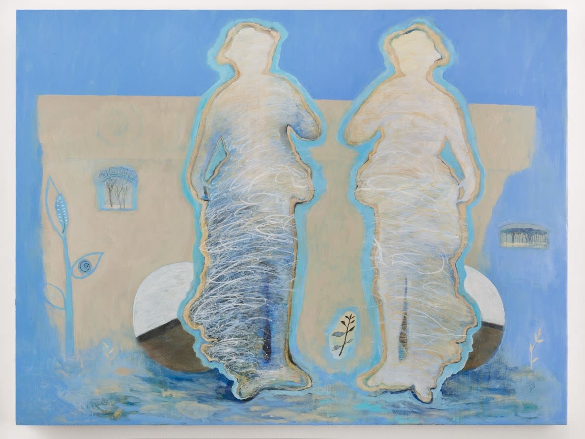 The show features new work from both artists, but makes space for the past as well. Four of Passalacqua's new pieces were collaged from things she collected over the years—sketches, pictures, and objects found in her Troy Laundry studio, brought together in pieces that deal directly with the exodus. In contrast, Black paints in geometric shapes and swirling colors that break into or surround the frames, in pieces that connect with the theme in more abstract ways. And while both artists have pointed to Greek art as an influence, many of Passalacqua’s paintings are deeply steeped in Hellenic themes.