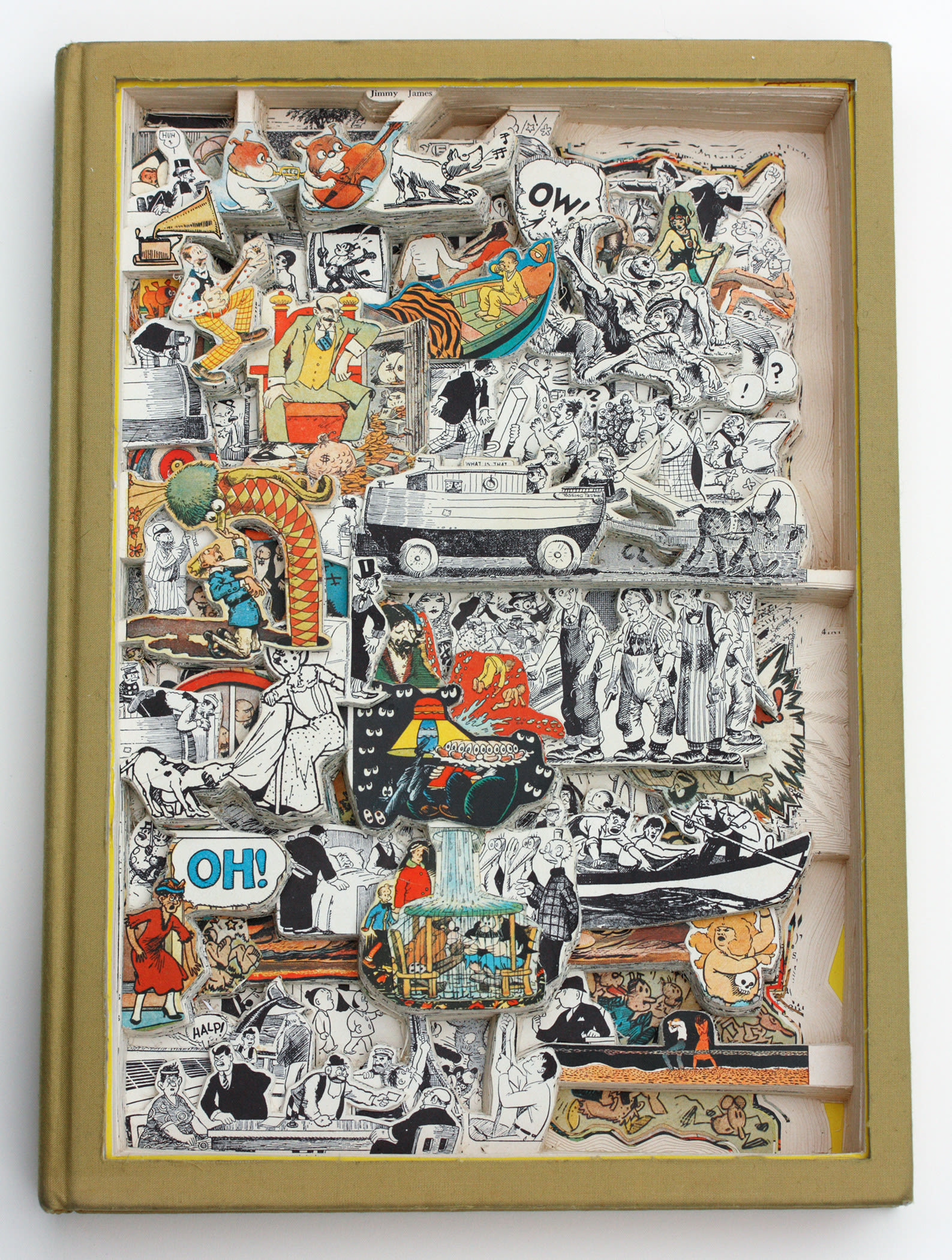 Other literary pieces in Allens’ excavation art include a book of Eastern Washington and Oregon plants, books of European history, and newspaper comics. He says he enjoys using these because of his interest in history. “I think about it as sort of looking back in time,” Allen says.