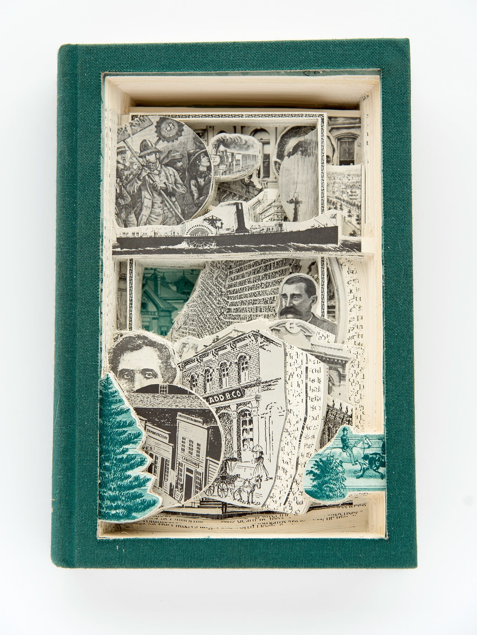 Allen’s work in Northwest Bound is heavily rooted in the history of the state—the centerpiece of the show is made from Oregon newspapers dating back to 1914. “I leave the pages bound, then I cut right through the covers, and one page at a time, I cut away and remove pages,” Allen explains. As he cuts down, he leaves behind images or words. “I’m revealing things that are already there…I just create these relief sculptures of the books and use content that’s there in a different way.”