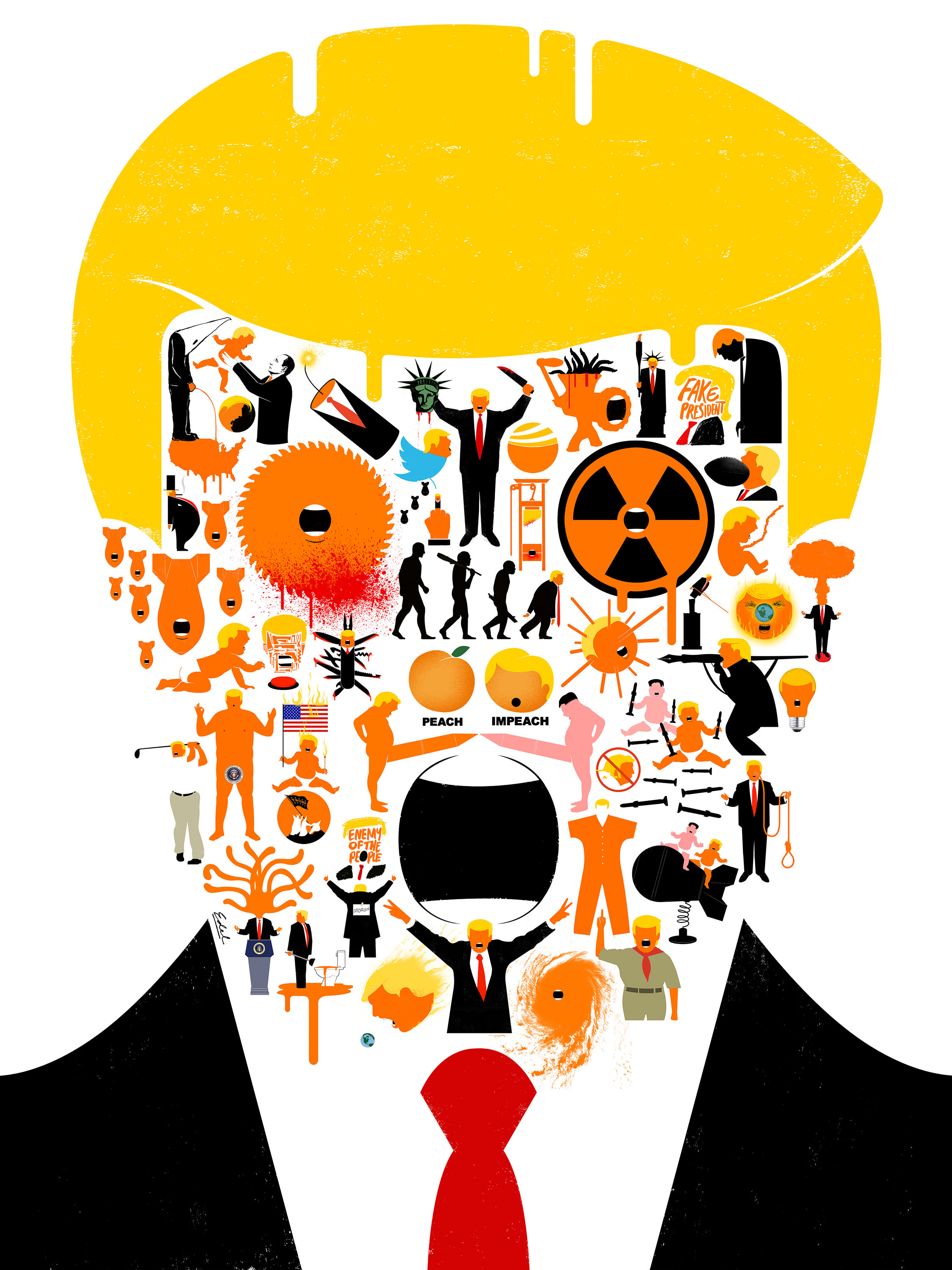 In August 2016, Time ran a cover with an orange face topped by yellow hair, the colors bleeding into the black background. The subject? Then-presidential hopeful Donald Trump. The title? "Meltdown." In October 2014, the magazine followed it up with the same orange face, now puddled on the page, titled "Total Meltdown." Then there was Der Spiegel’s "America First" cover, with Trump holding the severed head of the Statue of Liberty. The artist behind them all? Cuban-American Edel Rodriguez, dubbed “America’s illustrator in chief” by Fast Company.