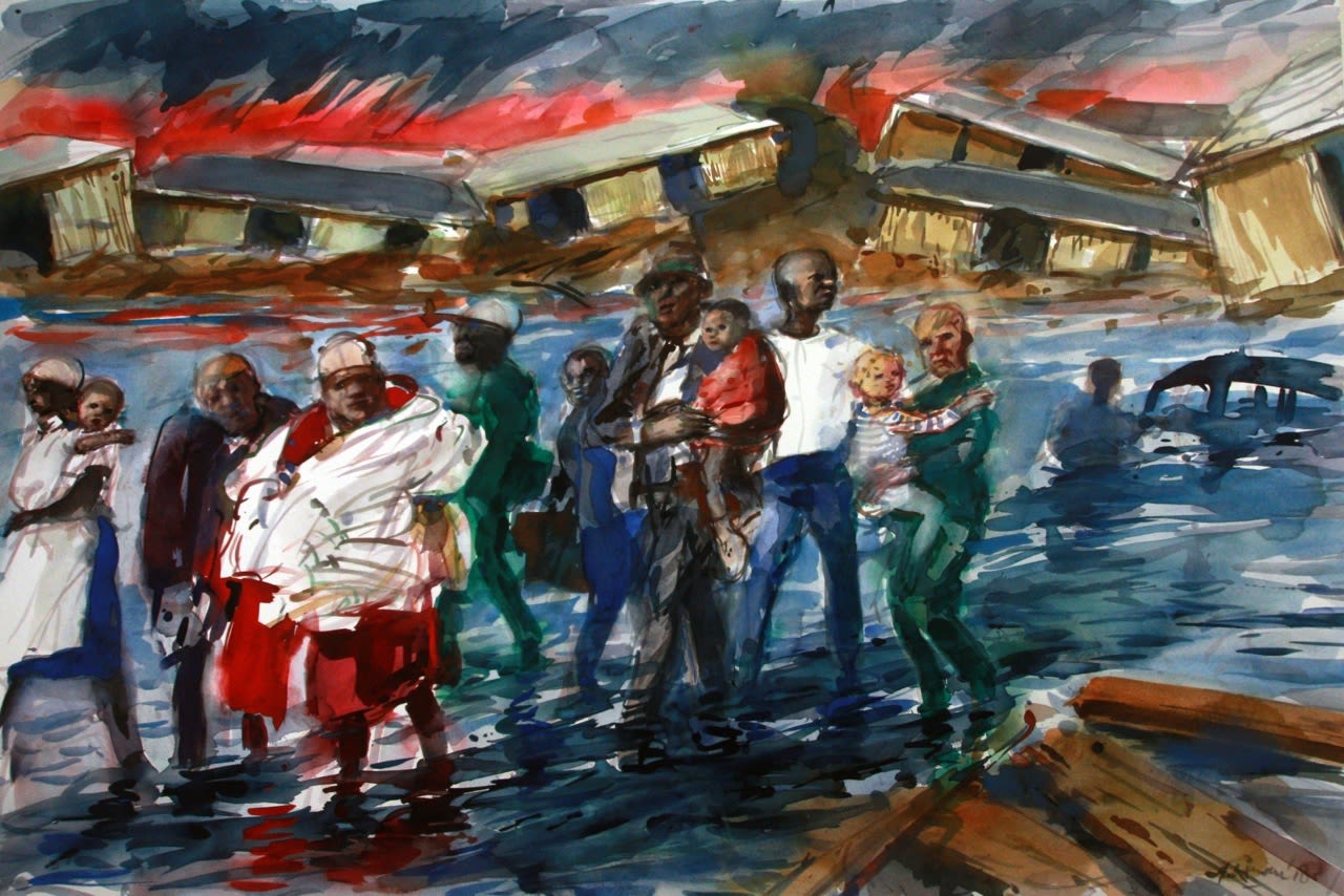 New work from Pander will be on display as part of the Vanport Mosaic Festival, for which he created a series of large scale watercolors. The exhibit will also include Pander’s depictions of the so-called Liberty ships, cargo ships which delivered supplies for survival both during and after World War II, and were built by the people of Vanport.