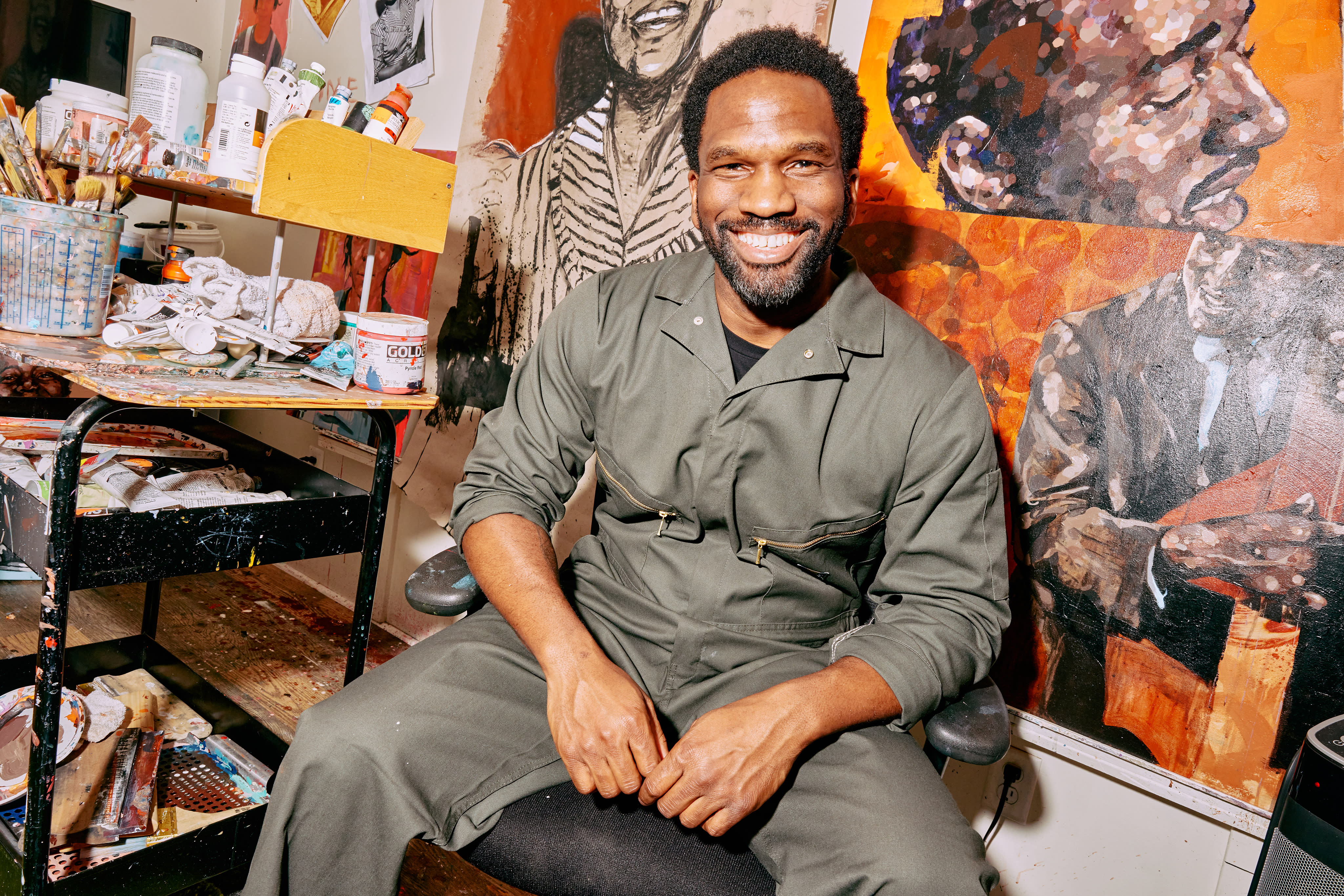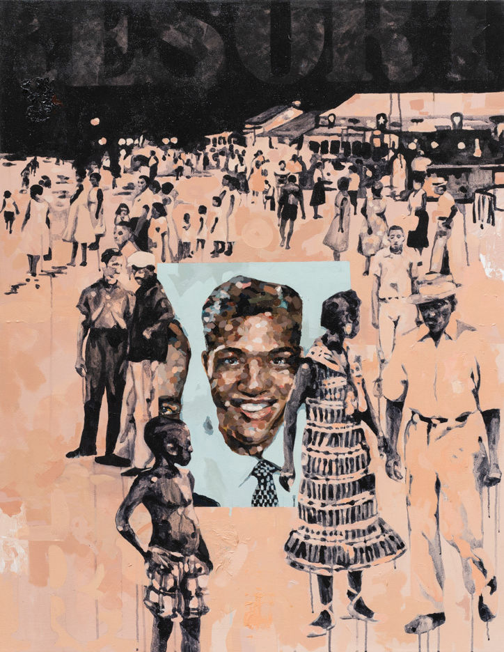 Davis’s distinctly collage-like paintings always promise a story. Trace his references, and you’ll find Black pioneers and overlooked or ignored Black musicians and athletes. This conceit has driven years of painting series, and Davis is nowhere near exhausting the idea of its energy. His subject in from the stage, a calling… is Black performance. How have dance, music, comedy, vaudeville, magic, and more—stagecraft, wholesale—served as an escape, a form of joyous expression but also exploitation, of the Black experience historically? What about today? His pictures give due posthumous credit to their subjects while exploring and complicating their legacies in the present tense.