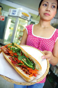 Soft inside and flaky on the outside—that’s the kind of baguette you want to bite into when you’re eating banh mi, the classic French-inspired sandwich of Vietnam. It shouldn’t be too chewy, but instead slightly airy, with a smooth, toasted exterior. And most important, it should be baked fresh, on-site. Fortunately for us, the baguettes used for the banh mi at tidy and friendly Binh Minh fulfill each of these ideals. At the center of the peerless nine-inch baguette, a balance of salty and sweet, tangy and spicy in the form of succulent barbecued pork, bright orange slivers of pickled carrot, fragrant cilantro, crunchy shredded daikon radish, fresh jalapeños, and a slathering of mayonnaise. There are other combinations, of course, but after your first mouthful of this version, your search for the consummate banh mi will be over.