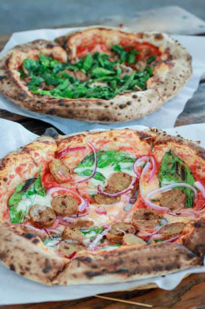 With an impressive wood-fired pizza oven tucked inside their cart, these tattooed pizzaiolos serve up irresistible, perfectly sized Italian-style pies—with the added twist of a thin, crispy, whole-wheat crust. Pyro’s Traditional Margarita is a stunning exercise in simplicity: fresh basil and organic extra-virgin olive oil sing against a background of mellow, homemade mozzarella and tangy marinara sauce.