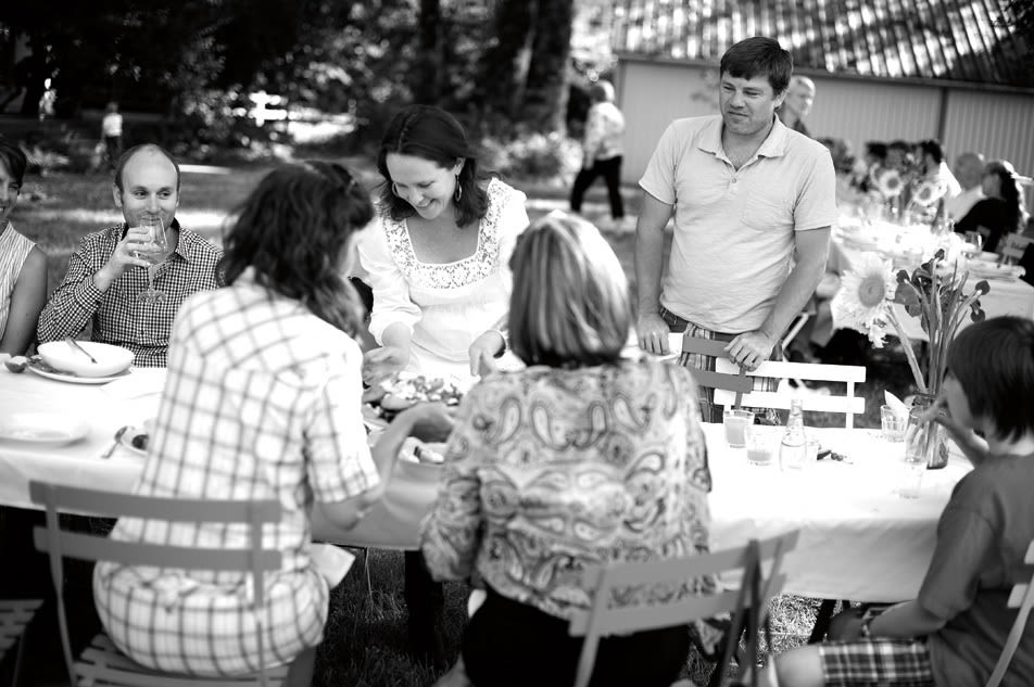 ON A COOLISH AFTERNOON in June, 65 food lovers—families, a small flock of LA refugees, and a posse of French-speaking oenophiles—convened around two long tables covered in white linen, big Ikea plates, and bursting peonies for three hours to savor four courses of some of the best food to be found, farm-picked, fresh-butchered, and wood-fired just steps away.