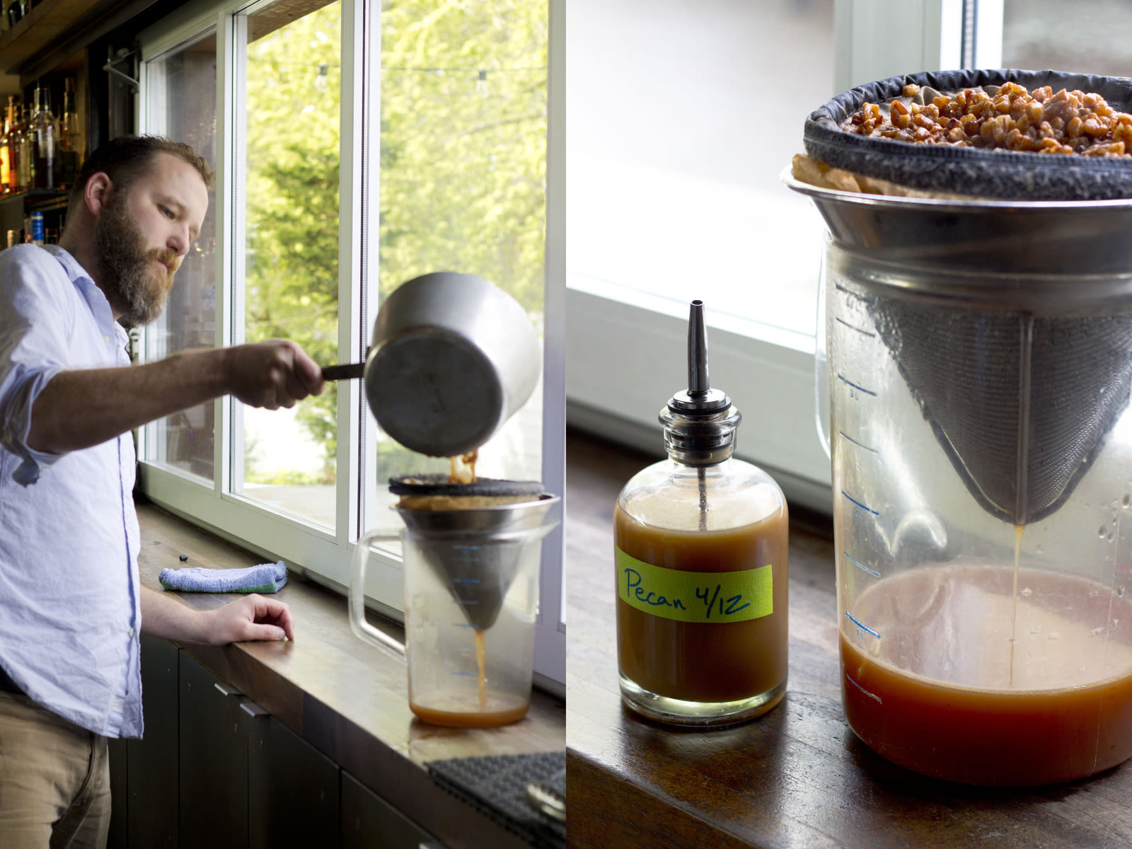 Developed by mixologist mastermind Evan Zimmerman in 2008, this warming whiskey cocktail comes together with a sweet, nutty pecan syrup, a zing of amontillado sherry, and most importantly, a heady nose of smoked ice. The basic elements—pecans, whiskey, sherry—are evocative of Zimmerman's childhood in Virginia. Sipping this drink has the same effect as taking a swig of Jack Daniels two feet from a blazing bonfire.