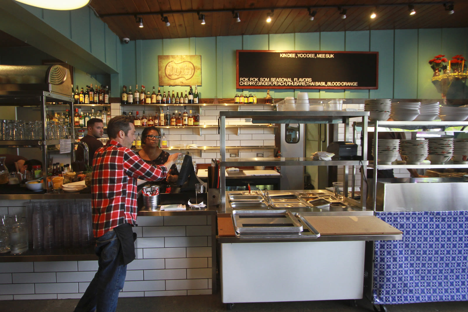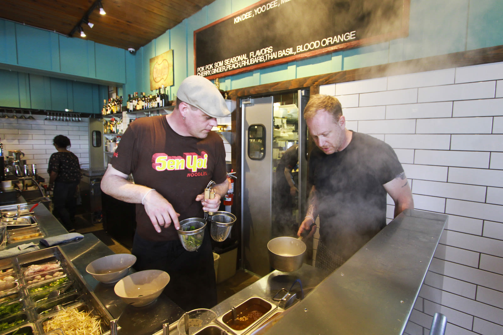The wait is over: Andy Ricker's noodle house Sen Yai has landed. The James Beard Award-winning Pok Pok mastermind has transformed the former Kappaya sushi space on SE Division into a teal-hued Thai breakfast, lunch, and dinner spot with a focus on Kuaytiaw, stir-fried and broth-laden noodles—think colorful Portland-friendly comfort fare with a spicy twist. All photos by Allison Jones.
