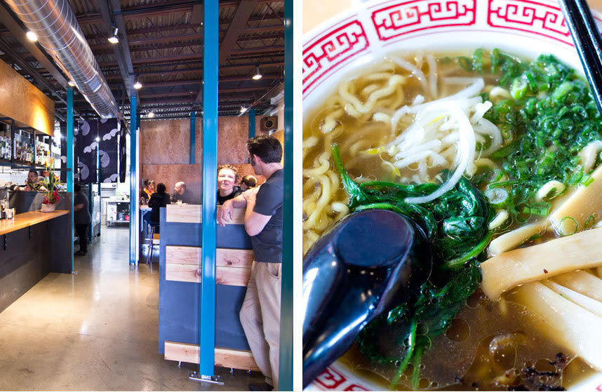 The narrow 500-square foot space mimics its big sister with concrete floors, reused wood, and teal beam accents. Each table holds a kit of ramen essentials: Thai and ancho chile oil, sesame seed grinders, and individual trays with whole garlic cloves and garlic presses to be used with discretion.