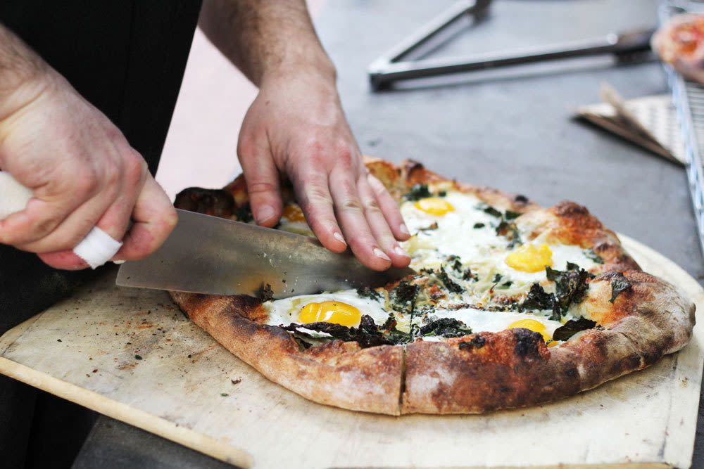 The hottest pair of wheels at Pioneer Square belongs to Tastebud, the wood-fired farmer’s market icon. Mark Doxtader, dough maestro and Tastebud’s owner, has built his dream truck—a giant, fully mobile pizza oven. The brick-red customized Sterling truck comes with hydraulic doors that swing open to reveal a kitchen with running water, refrigerators, storage and retail space. The wood-fueled Mugnaini oven, yanked with a crane from the original Tastebud restaurant, sits cemented in back weighing in at 3,500 pounds, spitting fire and charring dough.