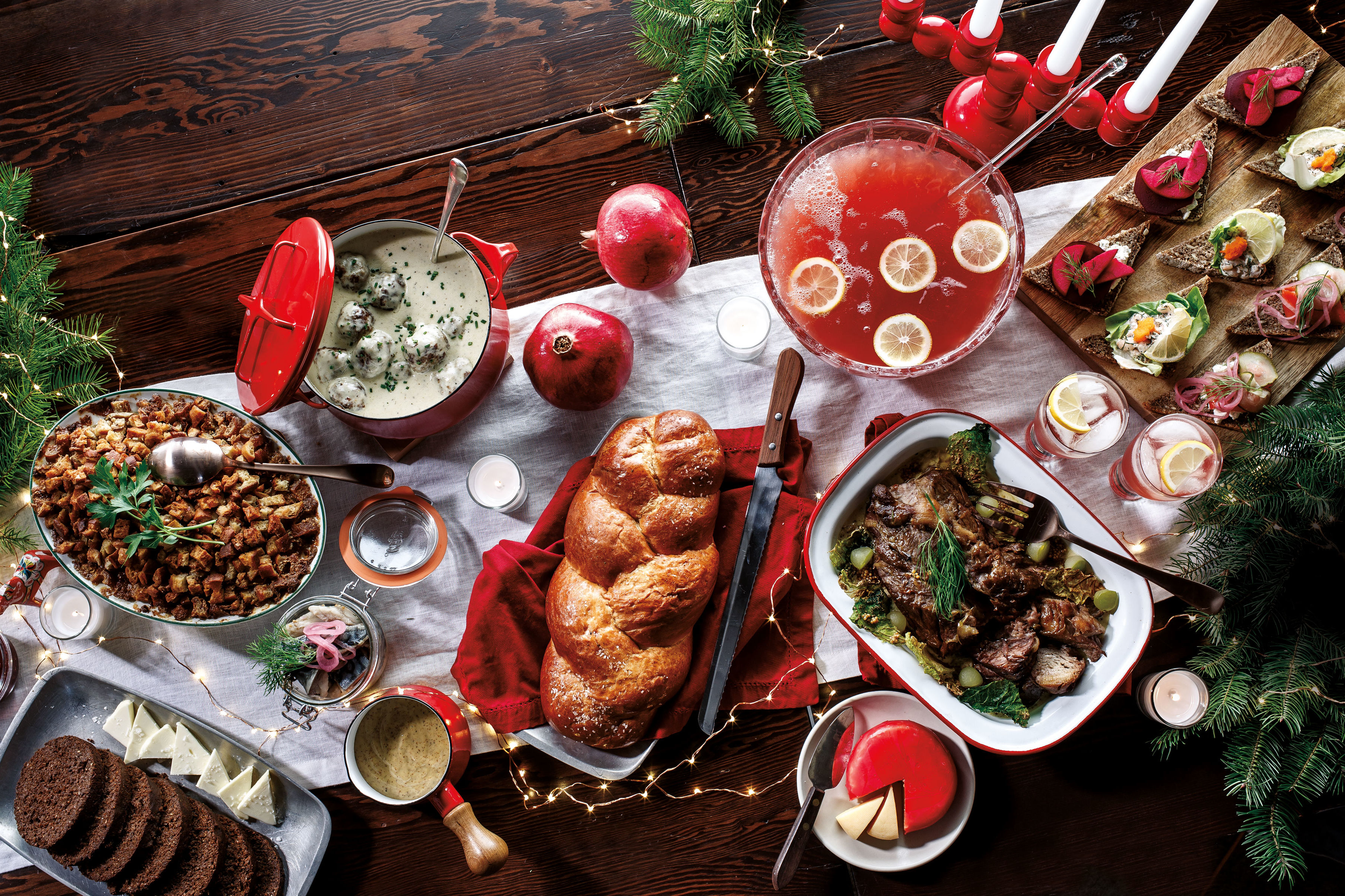 Pictured in the photo above: Red-and-white-enameled Dansk Kobenstyle pans and cookware, a midcentury classic, set a merry tone for a Scandinavian spread; psst—that casserole dish’s signature top pulls double duty as a trivet ($39.95–143, scandiaimports.com). Round out your buffet with a lineup of PDX Scan institution Broder’s smørrebrød open-faced sandwiches topped with pickled beets, shrimp salad, or gravlax. (Contact Broder Nord at 503-282-5555 or e-mail [email protected] for special-order options and pricing.)