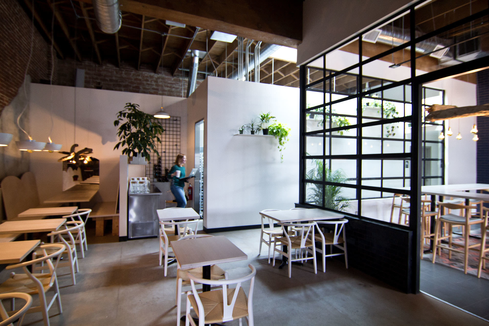 While Golden Rule Design's Adam Porterfield and Emily Katz designed the glass-walled space (down to the repurposed driftwood chandelier installations), Fox and Matteis had a major hand, constructing white oak tabletops and blow-torching their own wood panels, Japanese shou sugi ban-style.