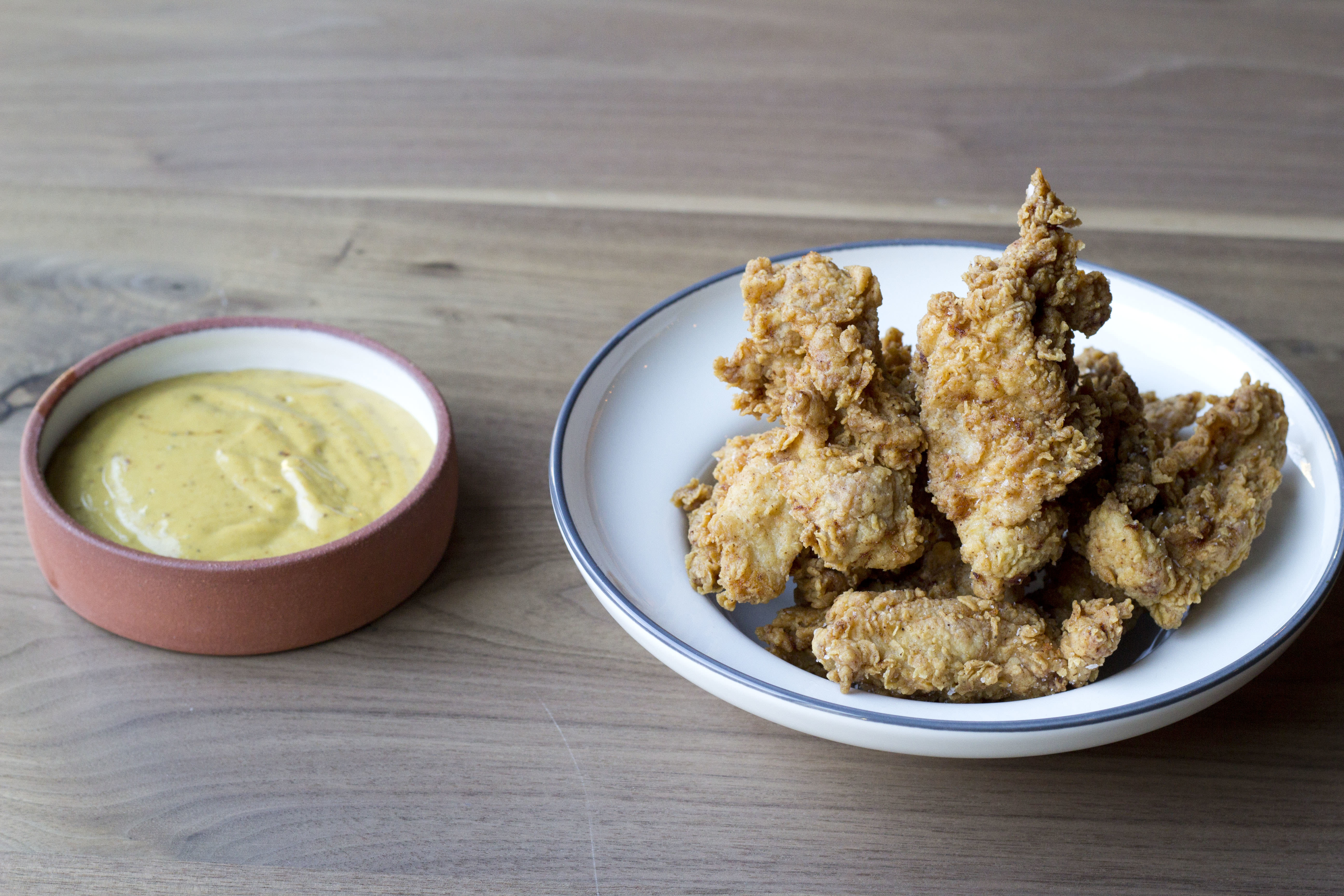 Doug Adams’ nine-item menu feels more like the 1950s than the early 1900s, with farm vegetable crudité dipped in green goddess ranch, shrimp cocktails with fresh horseradish, and Waldorf salad with walnuts, apples, blue cheese, and chicories. Yes, there is fried chicken, a signature of Adams’s—this time in chicken finger form with jalapeno ranch and hot honey mustard.