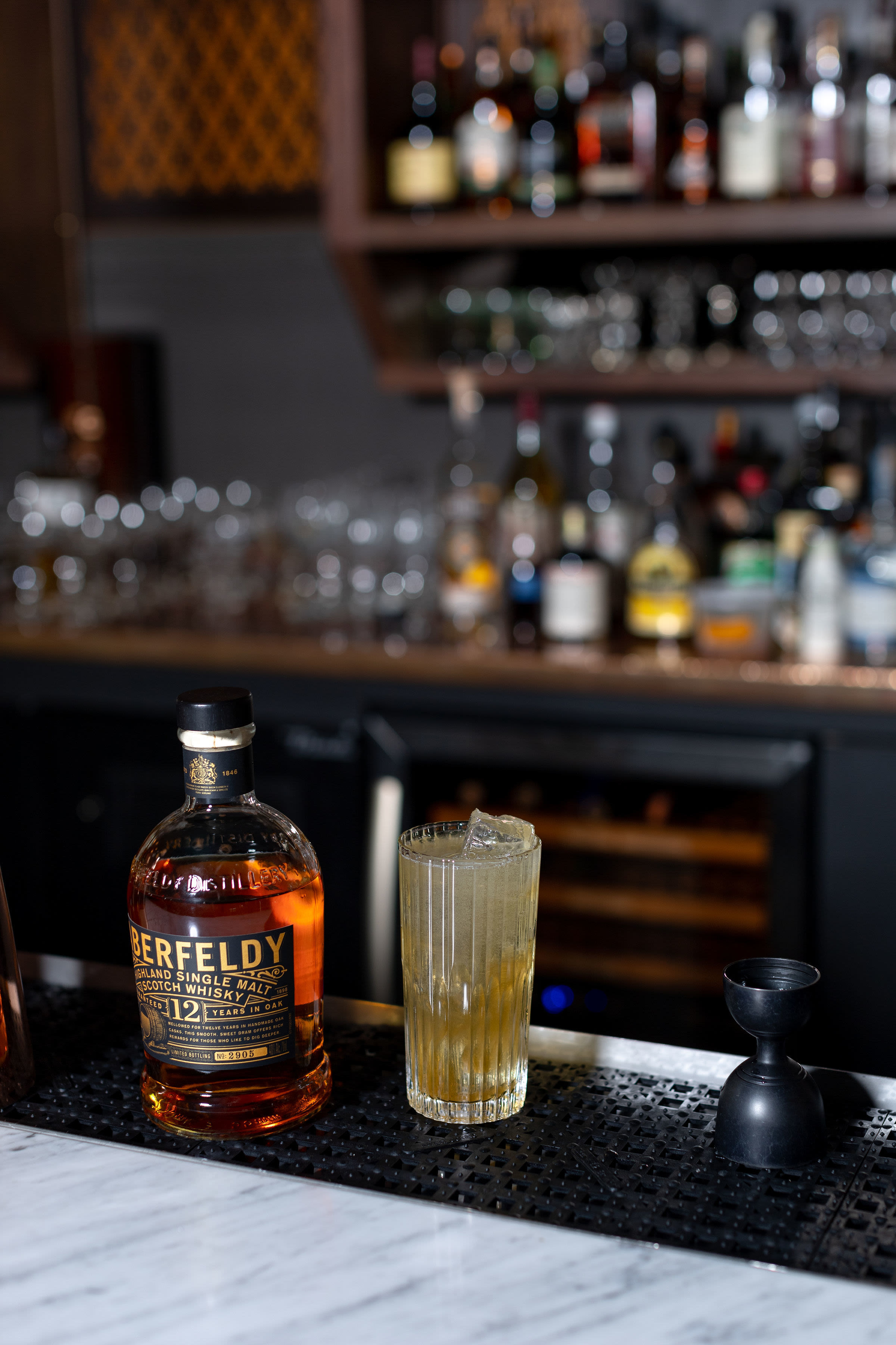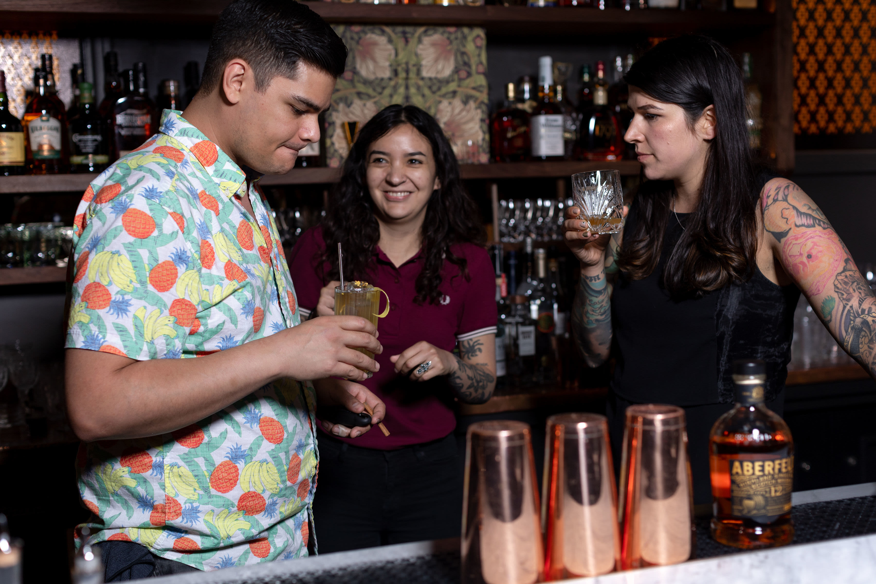 Unlike the Biwa space, which flooded with daytime natural light from its north- and east-facing street-level windows, Scotch Lodge is a dark, dreamy, drinking den: walnut paneling, peacock-green banquettes, a blue ceiling evoking deep water or night skies, and a heavy curtain walling off the bar proper from an entry stairwell papered in lush, cupped flowers.