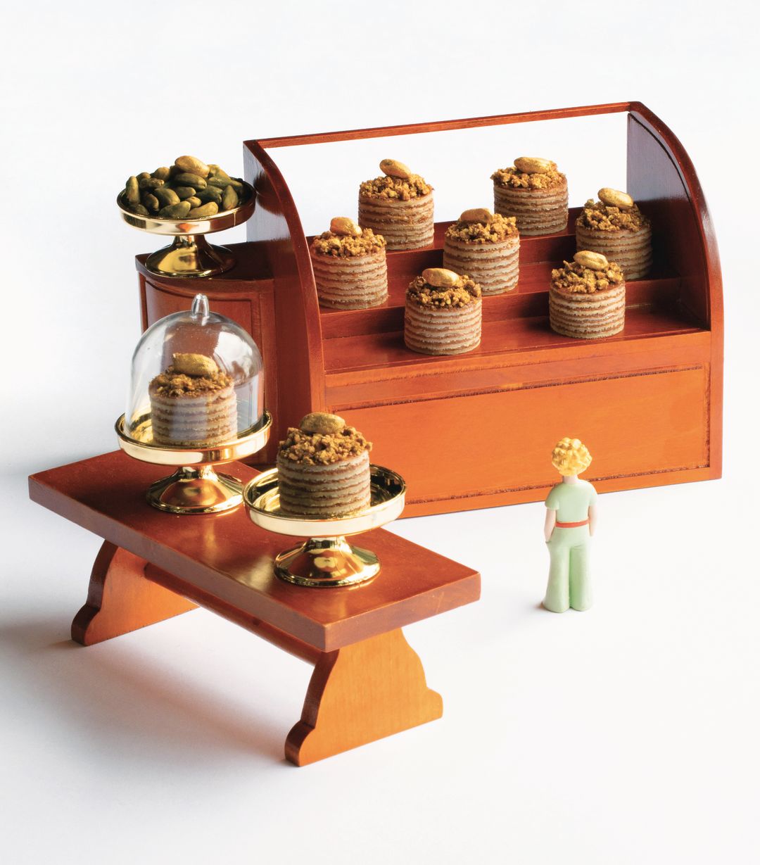 One of the book’s easiest petit four recipes is the 7-Layer “Cake”: miniature no-bake crêpe cakes soaked in Grand Marnier, layered with chocolate pastry cream and topped with candied pistachios. Try your hand at making them yourself: