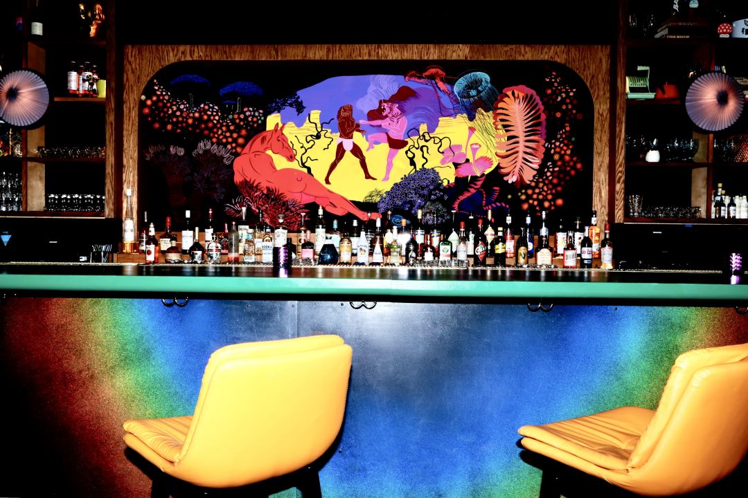 A hand-painted mural by Portland wallpaper artist Kate Blairstone hangs over the Houston Blacklight's new bar.