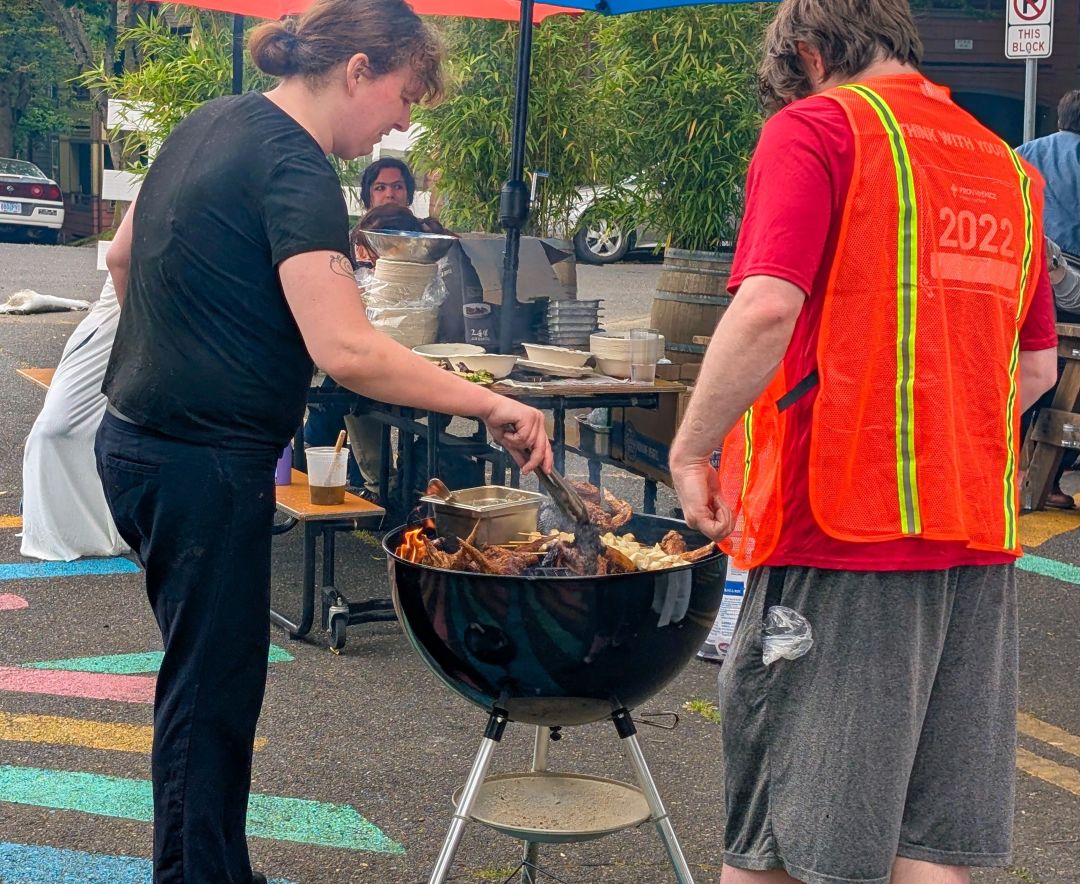 The first Salona pop-up in May 2025 was an ad hoc affair: plastic folding tables and a couple of sun tents in the parking lot of the Mayfly taproom in Kenton. Alexander and their team grilled chicken wings on a battered Weber grill and carefully dropped hand-formed millet balls into a pot of bubbling oil on a cracked hot plate. But Portland’s classics nerds (and the classically curious) showed up in force, and the event sold out in two hours. “I just got completely bum-rushed,” Alexander says. “It was very chaotic.”