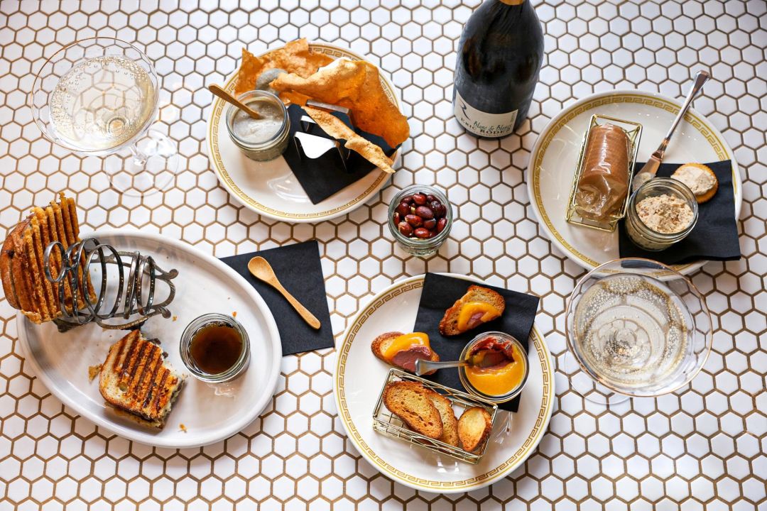 Past the sandwiches, the two-top in Buvons’s storefront window might also approximate the favorite seat at Les Caves, which is a couch squished into a little cubby carved out of the wall—a kind of wine fort for two. At Buvons, the best seat in the house gives optimum views of a salon-style display of Vejr’s mismatched art collection, which crawls up 35-foot-high walls lit mostly by candles. Immaculate vibes, no doubt, but the bar's name is French for “let’s drink,” and Vejr’s mission on that front is to upend myths about bubbly wines, those with and without alcohol.