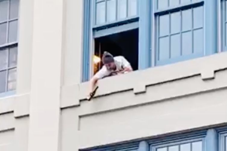 The man takes a large sip from his wine (Big Salt white from Newberg’s Ovum, FWIW). He looks down at the sound of a whistle, and sees the woman below.