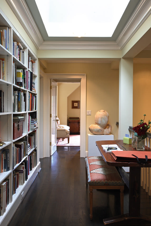 A second-floor stair landing may seem like an odd spot to put a home office, but that’s where interior designer Ann Waldman likes to work. The trestle table she uses as a desk is pushed against the wooden balustrade, overlooking the stairs and a periwinkle-blue painting of two frolicking nudes by Portland artist Michele Russo. The light is lovely: a soft glow emanates from a skylight in the recessed ceiling and plays across sand-colored walls, imparting a sense of serenity. Lingering...