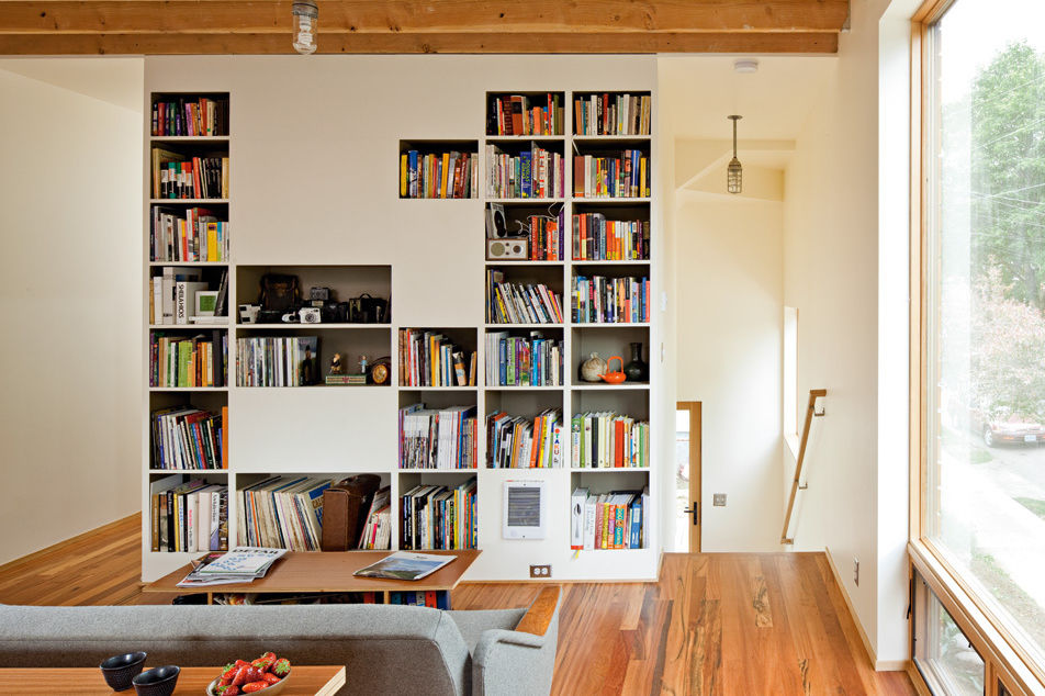 Using touch latches and drawer-pulls instead of hardware on FSC-certified cabinets yielded a clean aesthetic and saved money. Bovee and Kirkpatrick then used the leftover cabinet wood to craft the coffee table, dining table, and a side table for the kitchen.