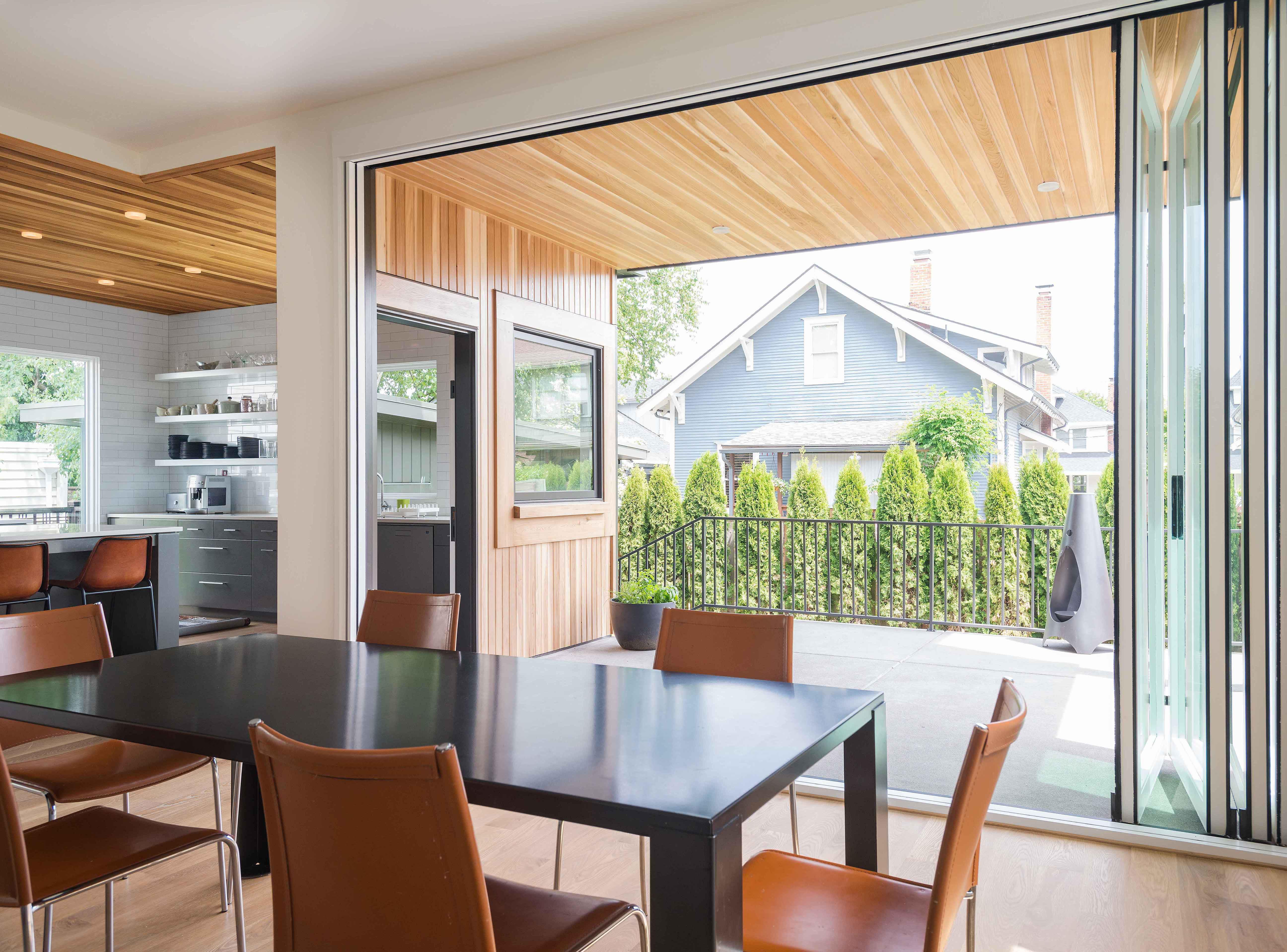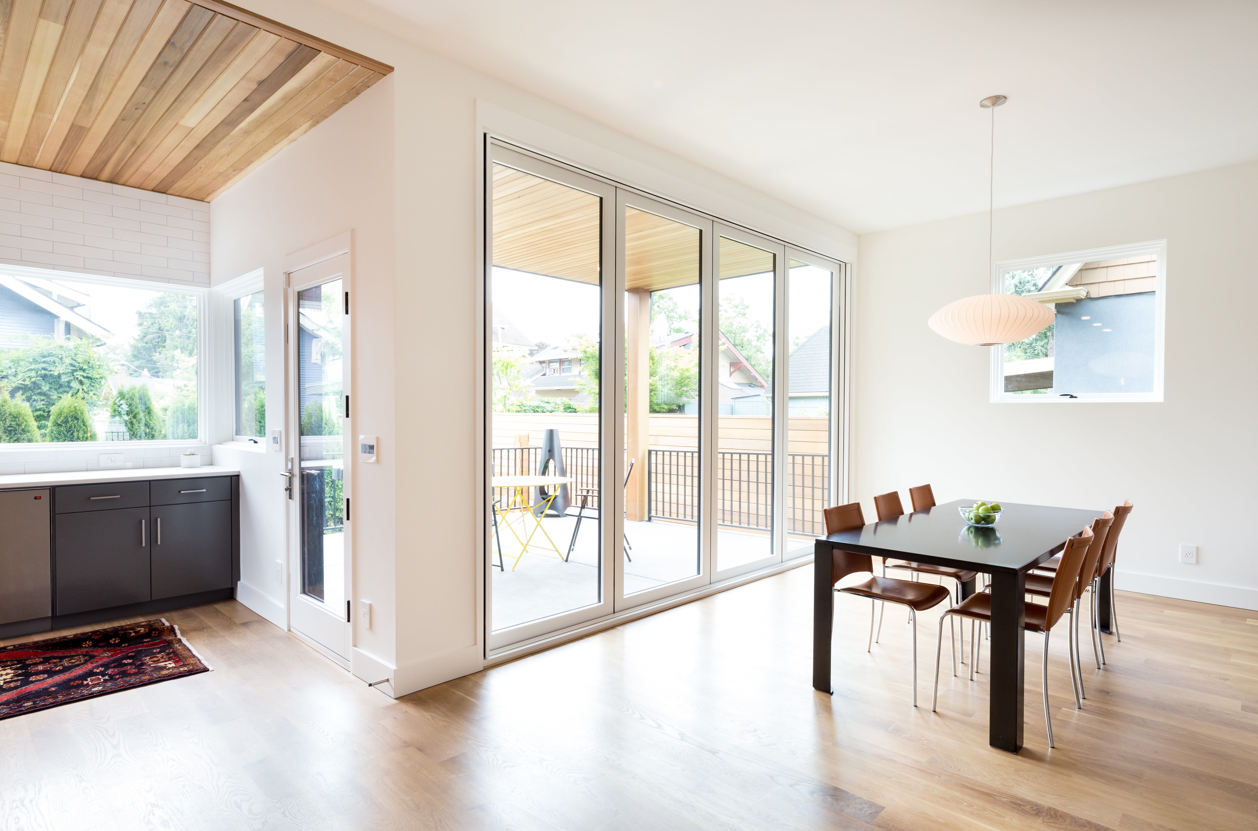 The house boasts intelligent thermostats and advanced insulation techniques, but the main green feature stands in the open, zigzag design and large windows, seamlessly merging the interior with exterior. “The emphasis is more on a quality of open space, like that which might be found in a small art gallery,” Skidmore says. The home has both front and back access to fresh air. This includes a large accordion glass door that opens to a raised back patio, providing the perfect setting for a neighborhood barbecue. "The large corner windows are placed high on the wall to keep the house naturally lit and reduce the need for electric lighting," Skidmore adds.