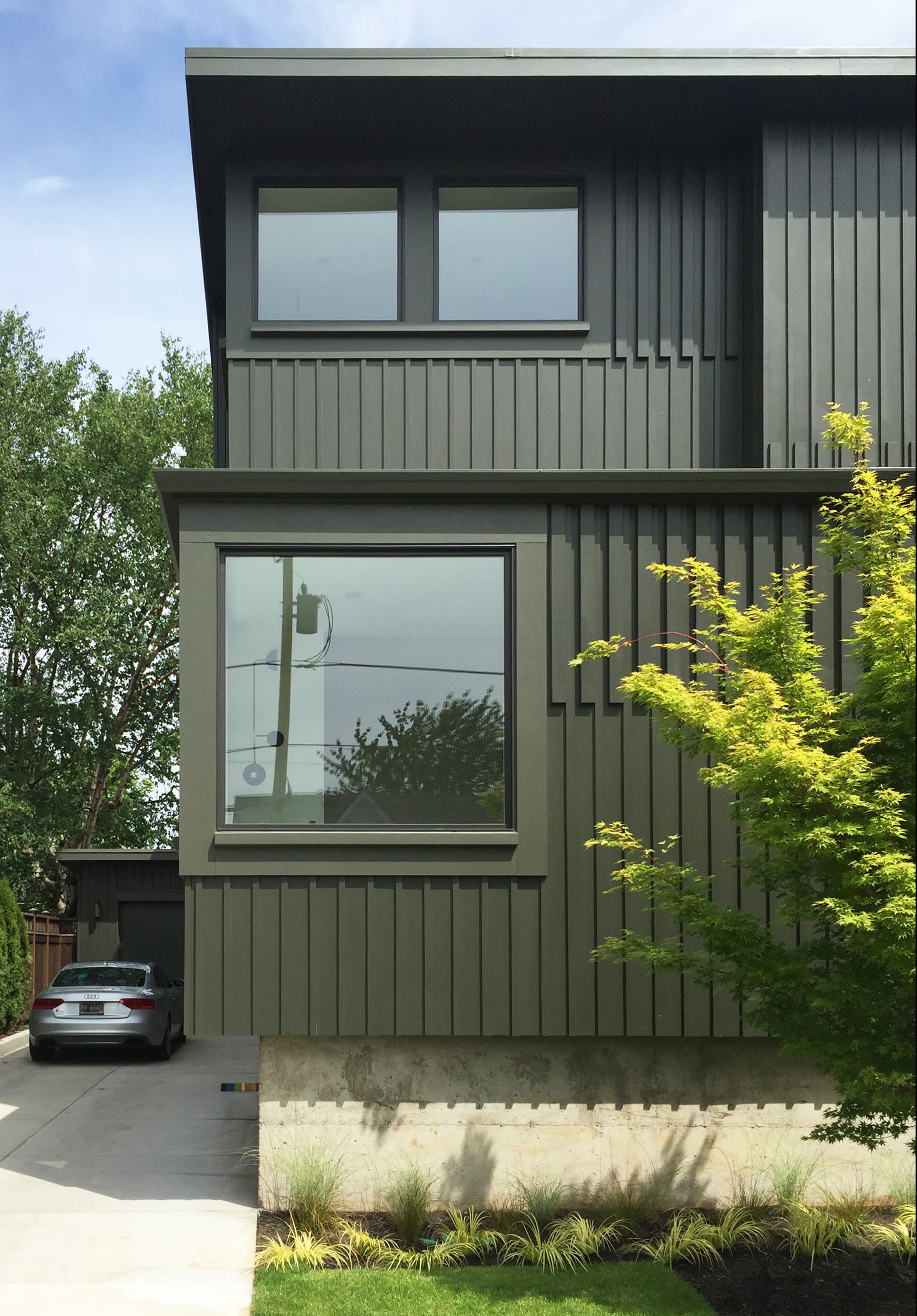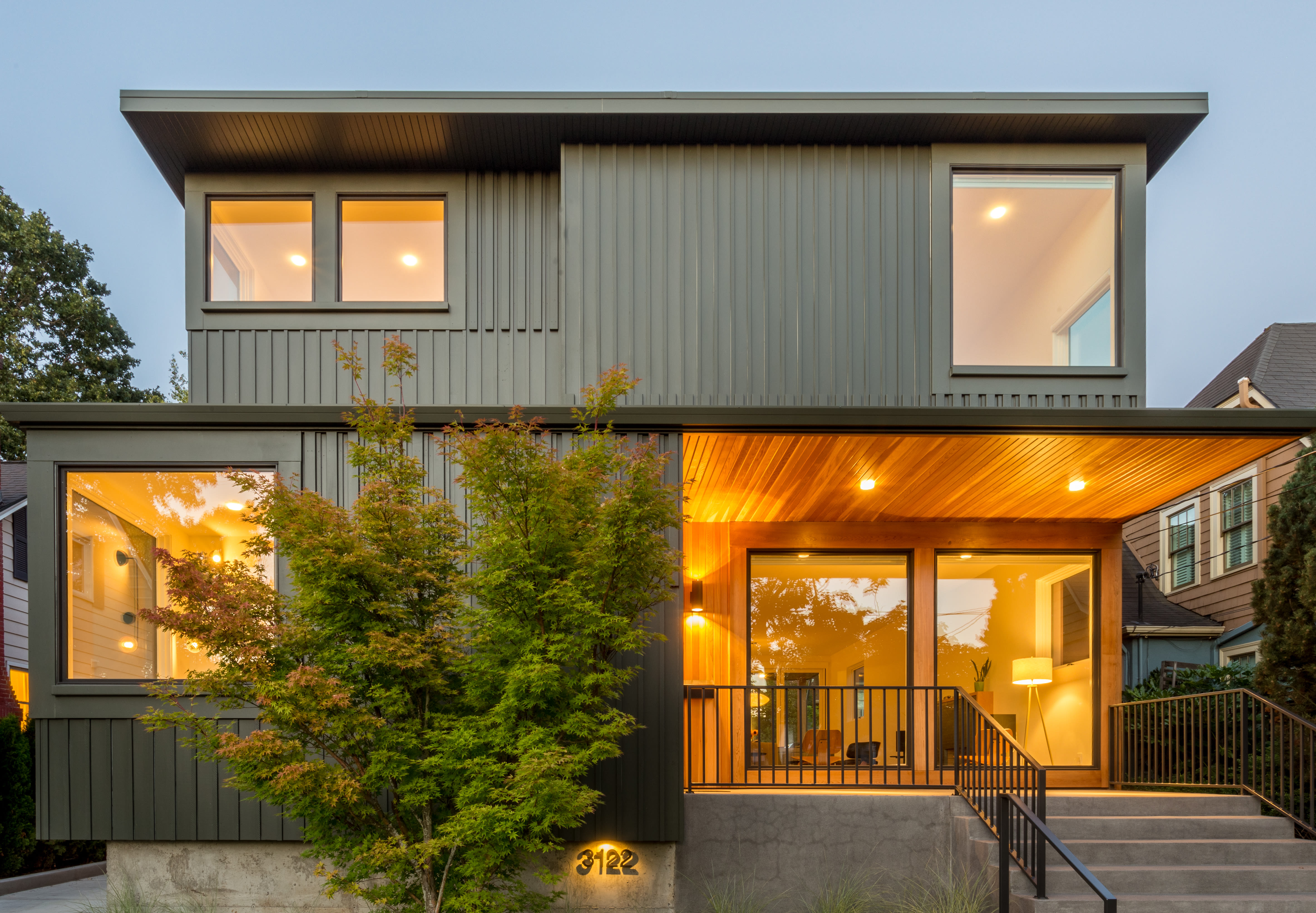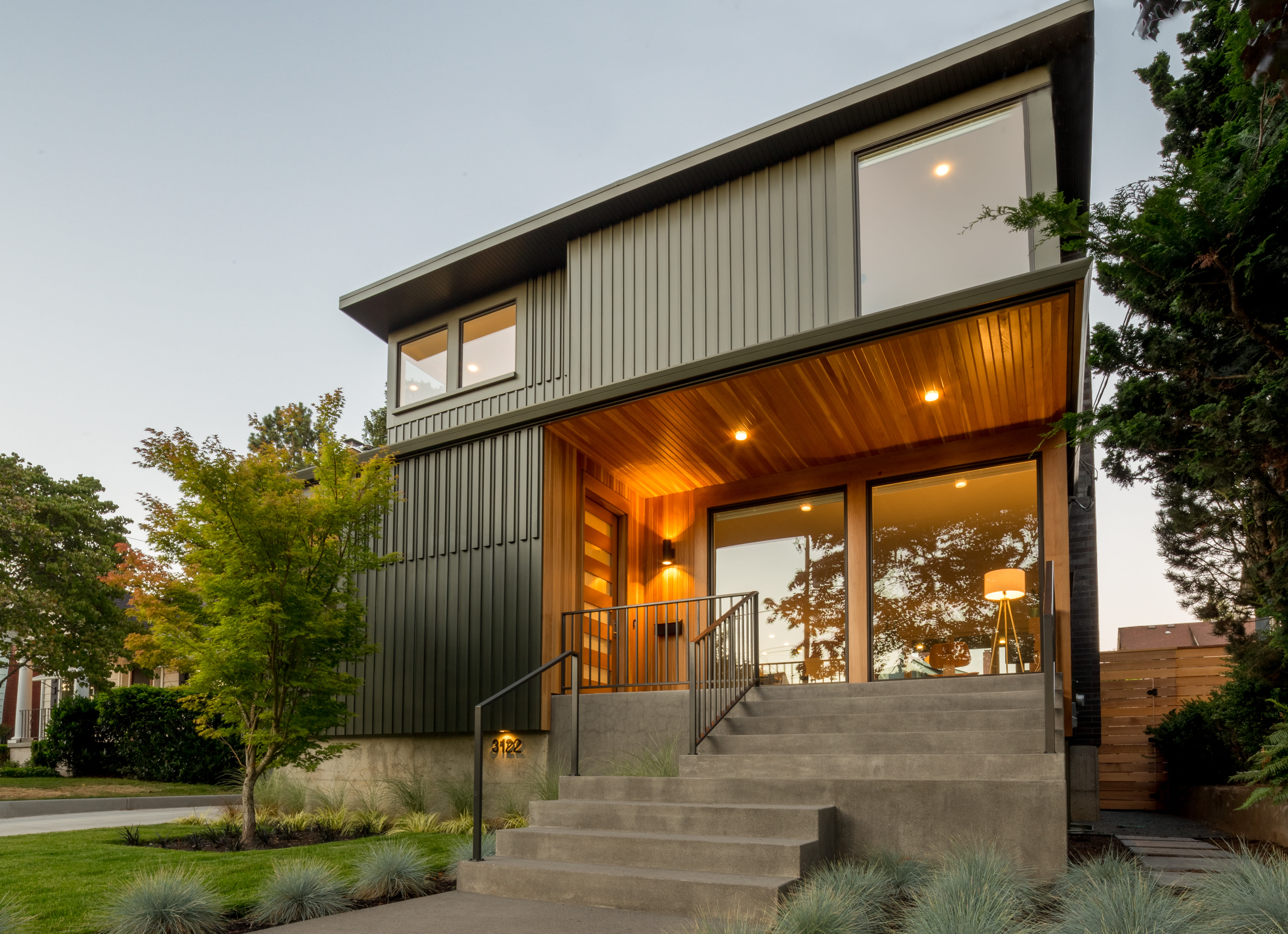 Nestled among the craftsman houses of its Alameda-Beaumont neighborhood, Heidi Beebe and Doug Skidmore, the two architectural minds behind Beebe Skidmore, built a modern 4,000-square-foot home expertly reflecting the rainy outdoors that surrounds it. The homeowners, a young family of four relocating from Chicago, decided on the muted forest green exterior after seeing a Burberry raincoat with the same woody color.