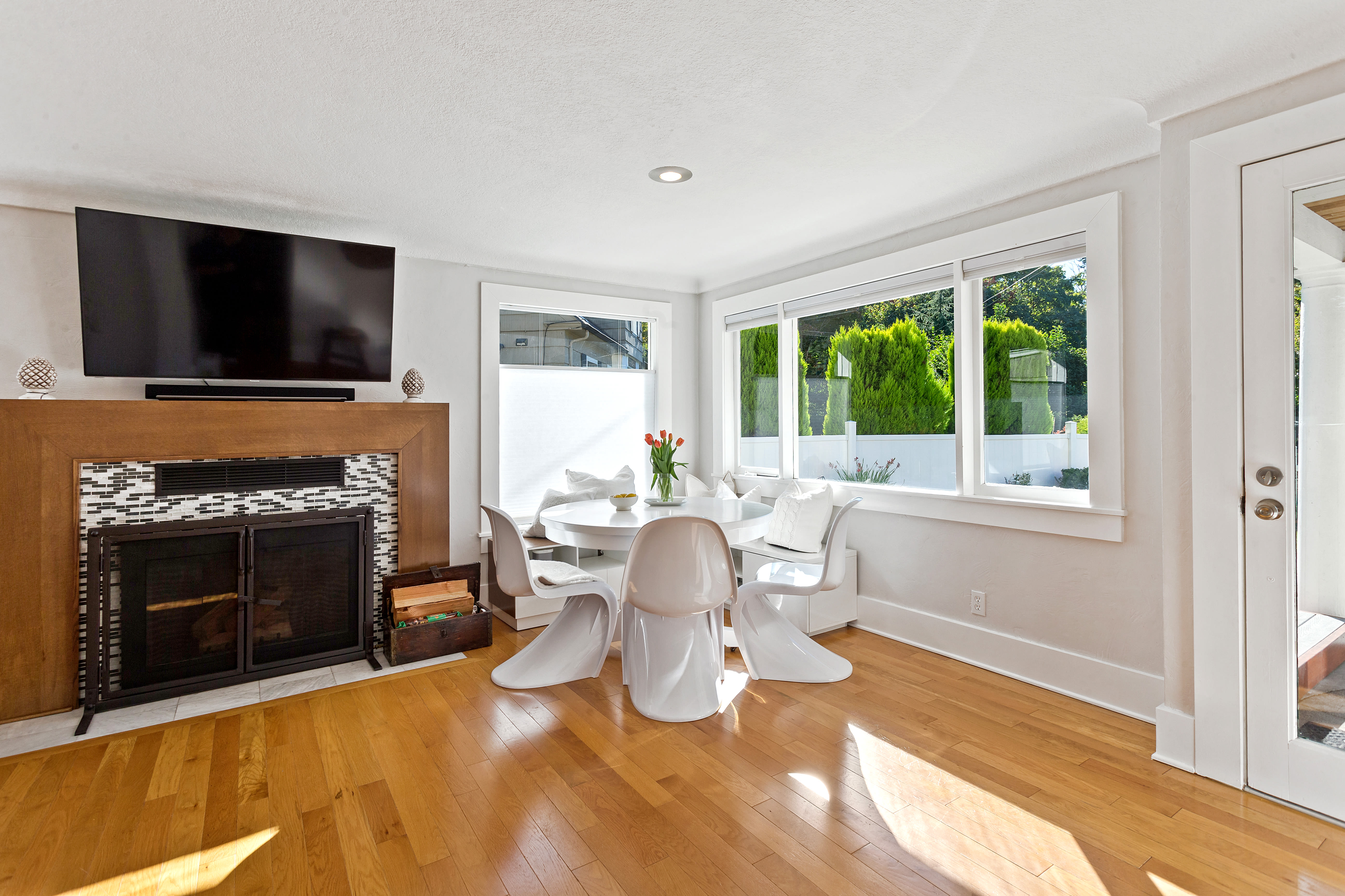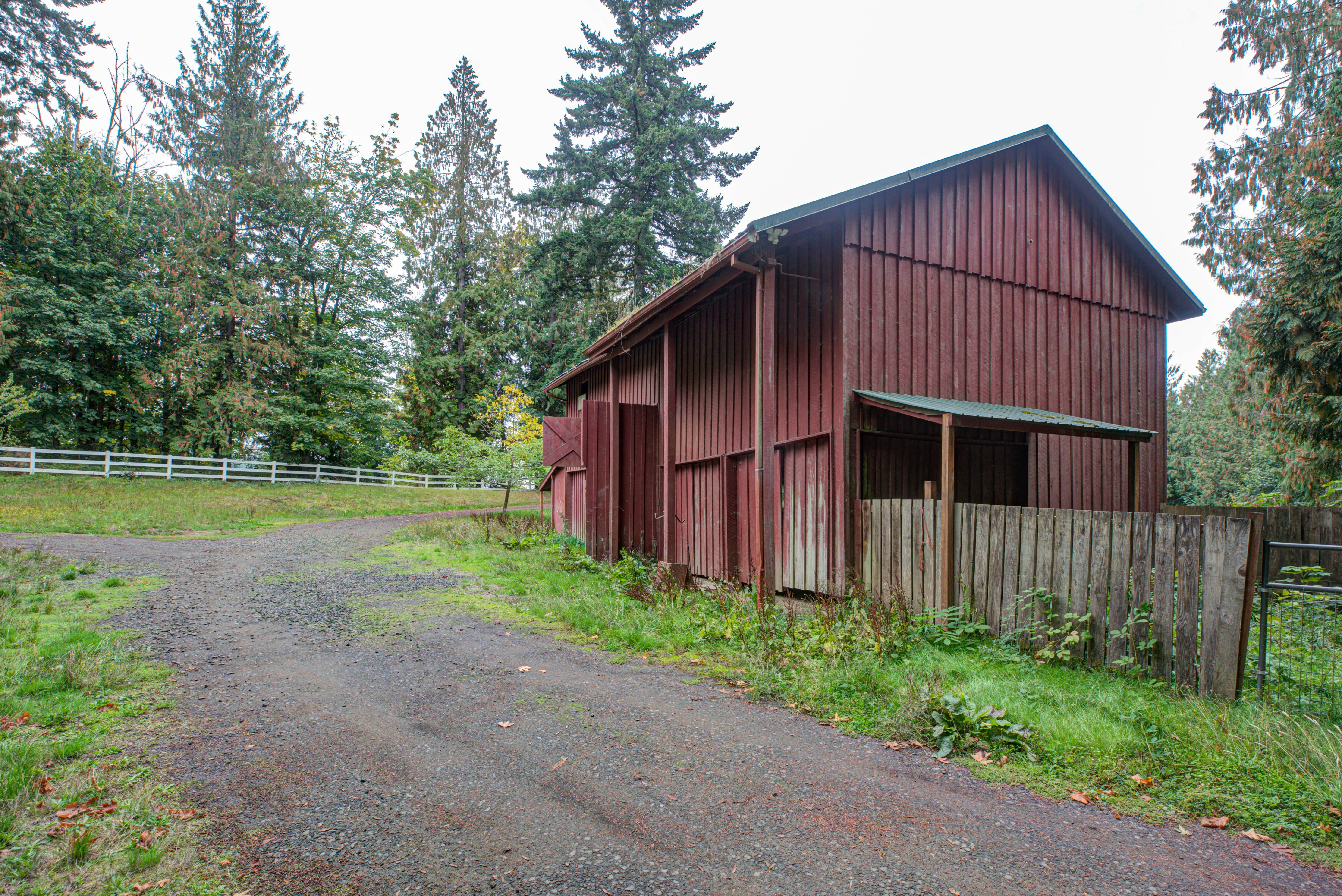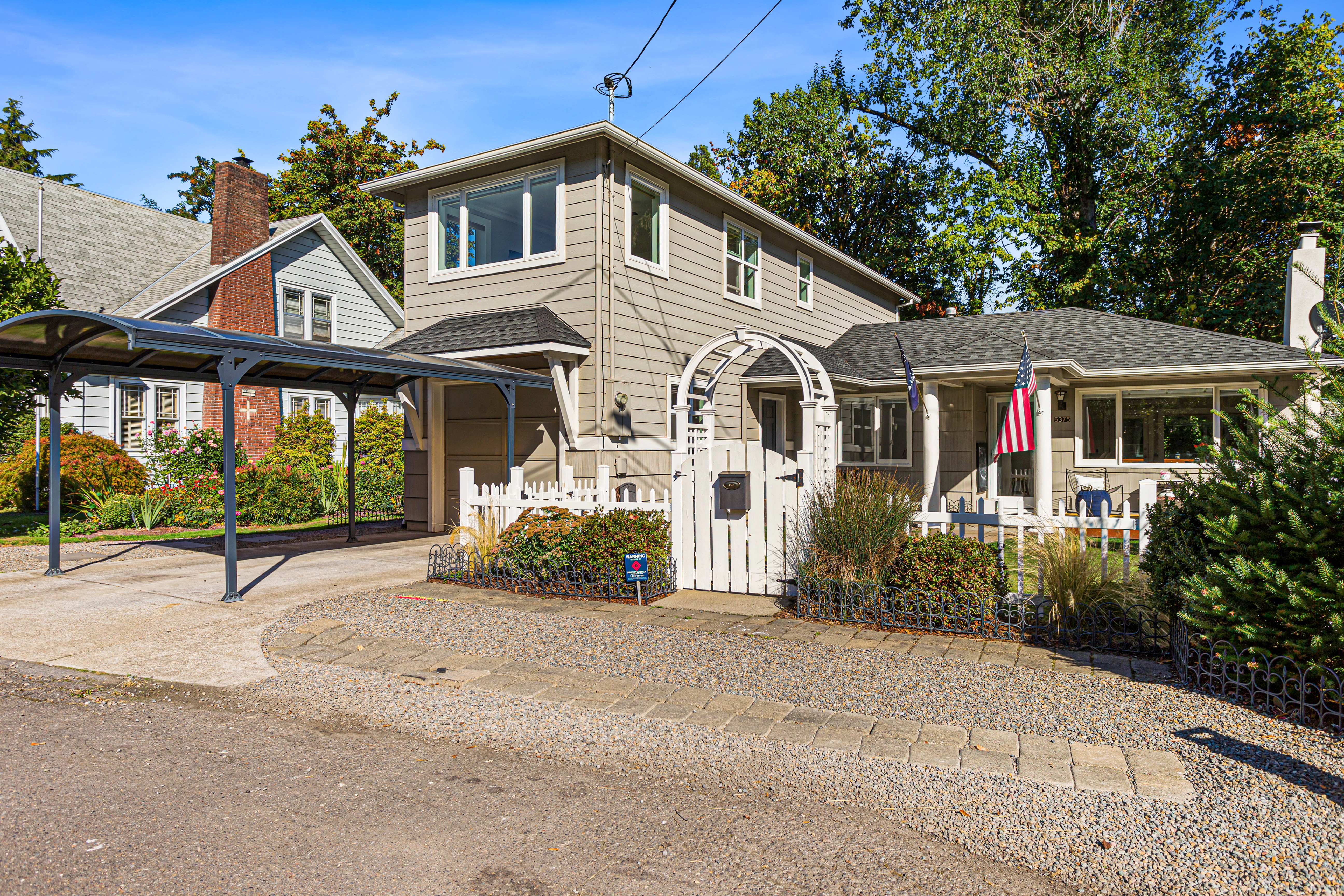 This West Linn home is surrounded by a white picket fence, and boasts a generous columned front porch. Inside, natural light spills into the living area and the dining room with tiled fireplace. A glass door leads to the back porch. There are two bedrooms and a bathroom on the main floor, as well. The upper floor is dedicated to the master bedroom and bathroom and large closet space with built-in organizers. Outside the home, next to the deck and fire pit, is a building outfitted to be an office space, perfect for working from home.