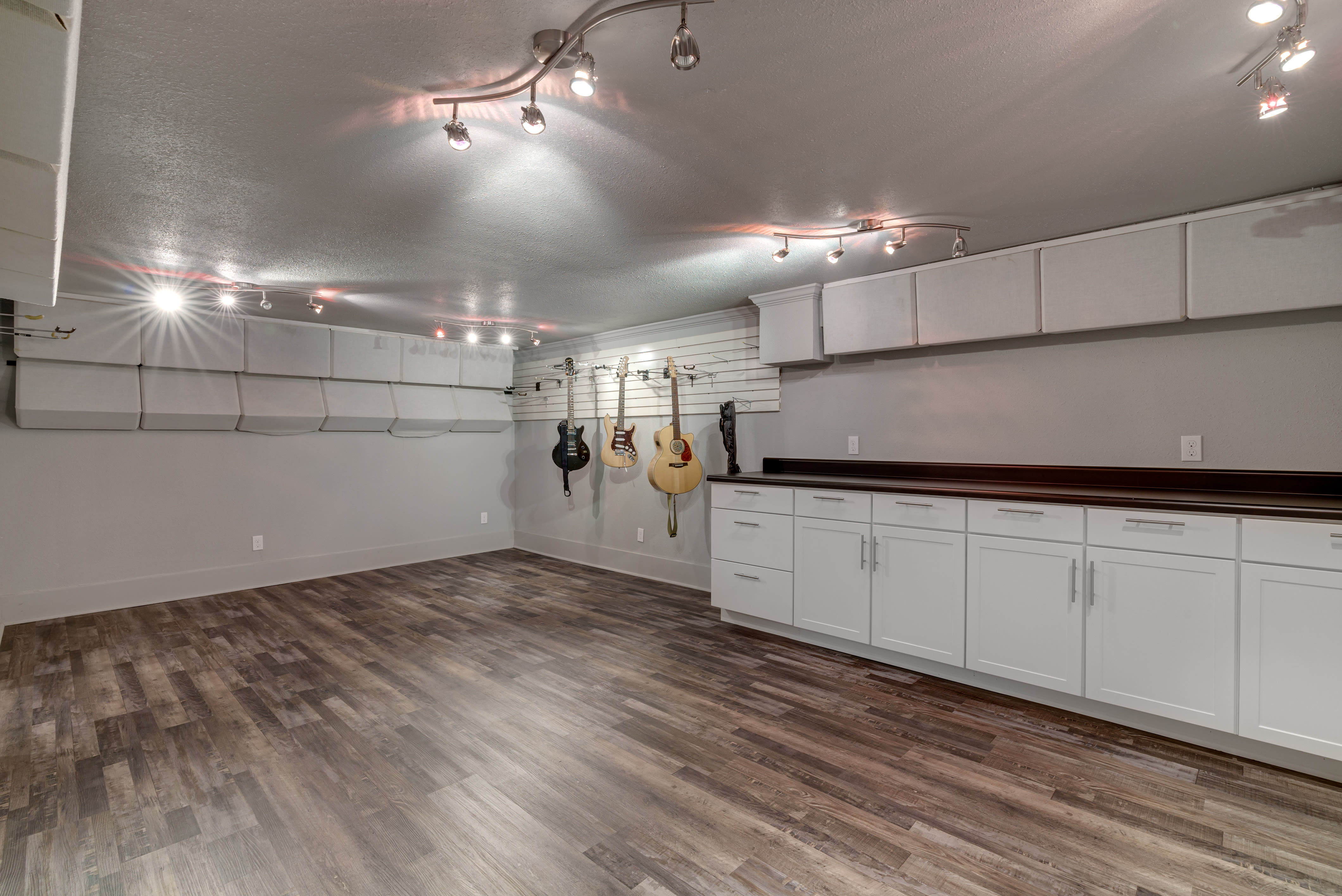 This 1940s home is built for entertaining, with plenty of period charm intact. Guests enter the front door into a cozy living room, one side flanked by a wooden mantel surrounded by built-in cabinetry with stained-glass panes; the other side is a brick fireplace also surrounded by wooden built-ins. The main floor also includes a second large living area that connects to the dining area and kitchen, a roomy main bedroom and bathroom, and an additional full bathroom. The top floor includes two other bedrooms, both with plenty of closet space. The bottom floor has the two final bathrooms, a large bedroom with an equally large closet, another living space, a large working space, and, finally, a music room or theater. Outside you’ll find a large back porch and a covered patio space below.