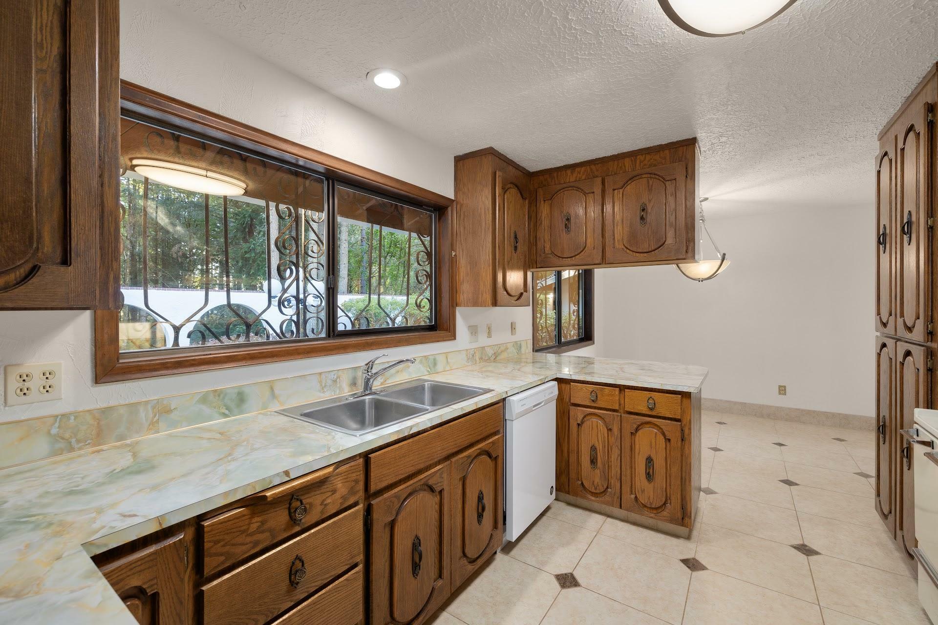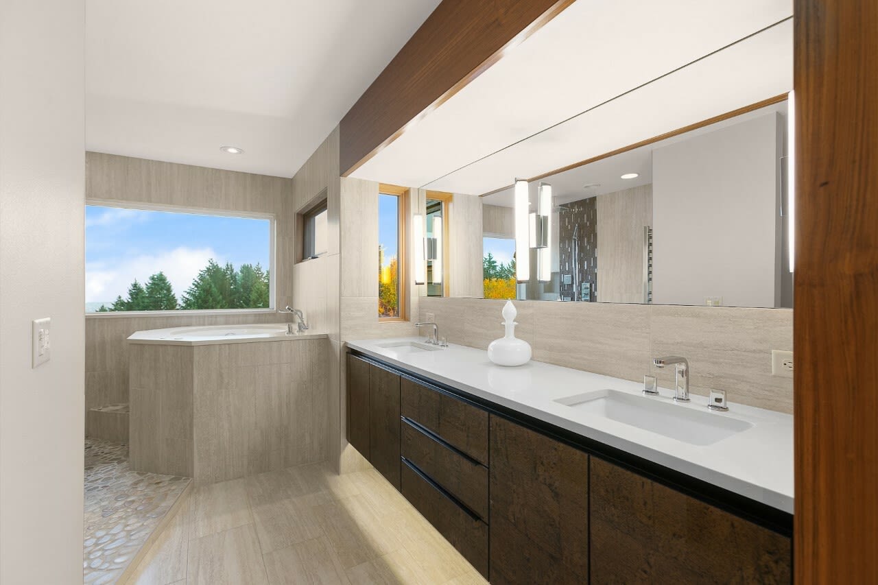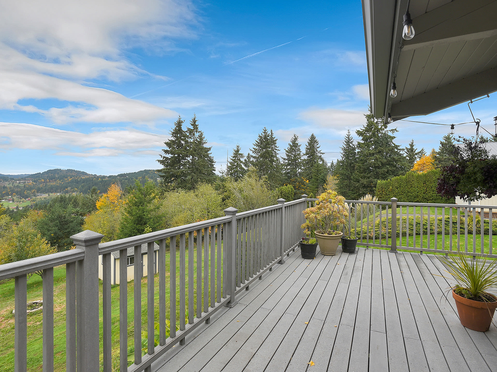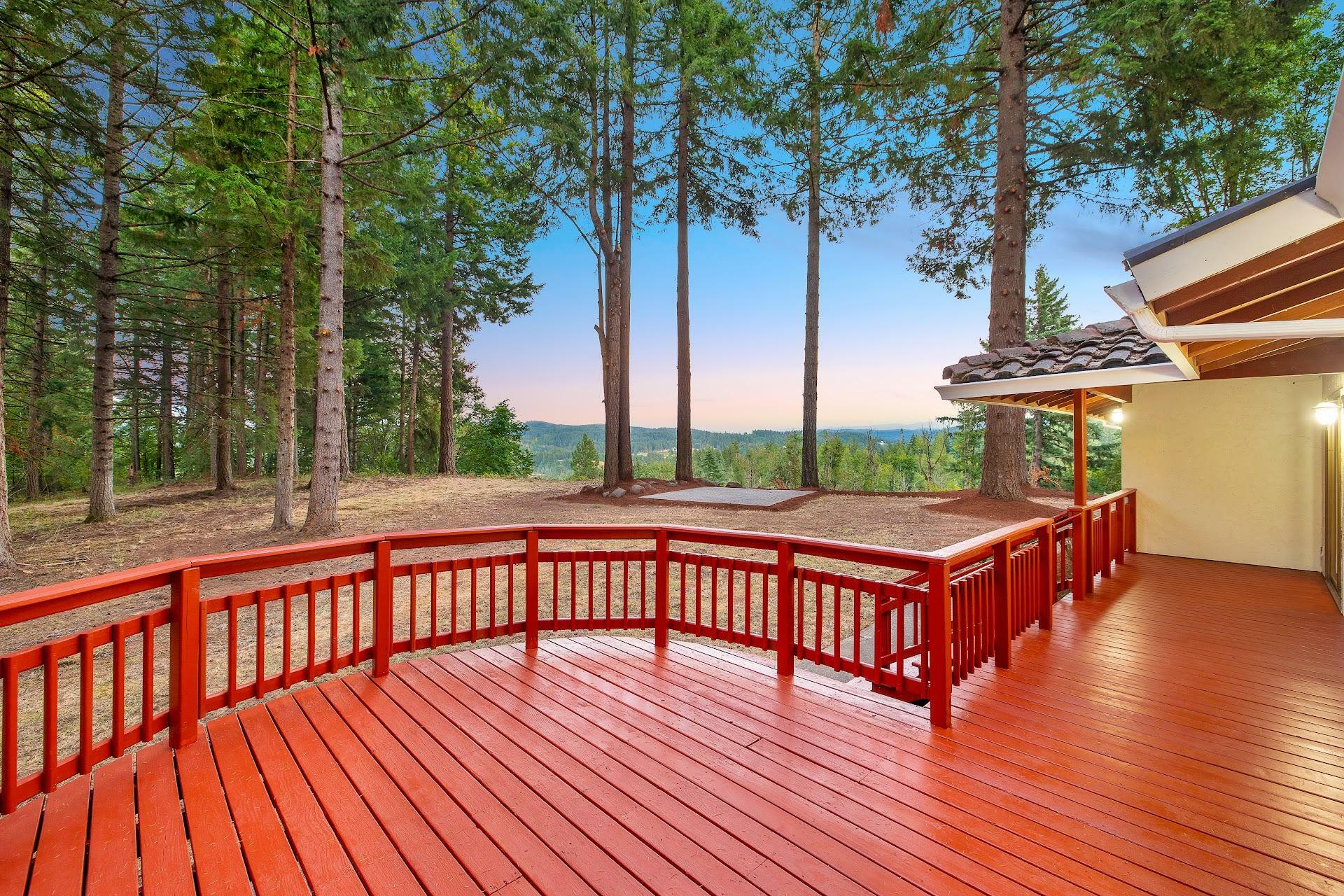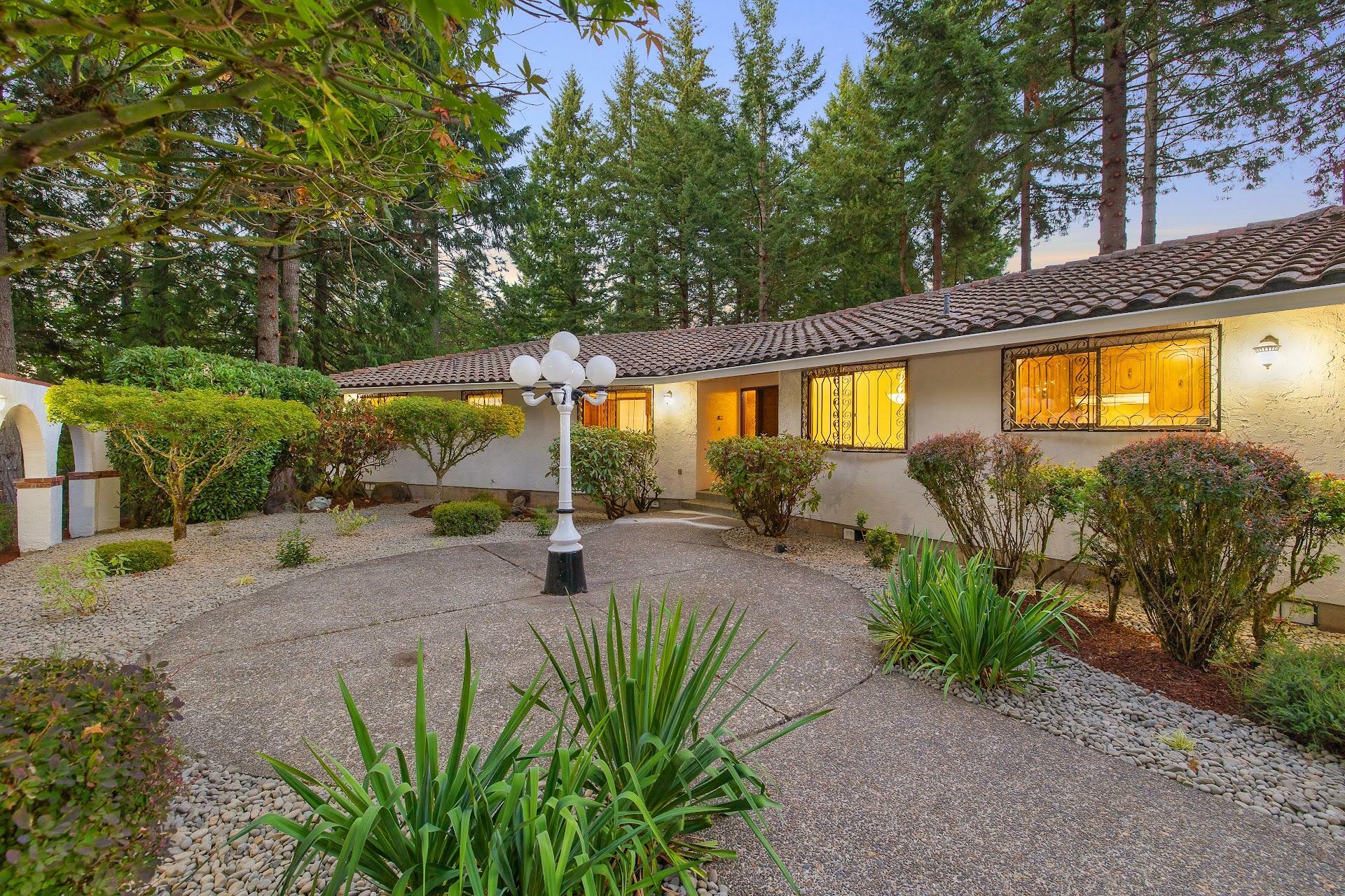This custom-designed oasis is located on 10 wooded acres in Oregon City and has views of Mount Hood. To get to the front door, you have to pass through a private courtyard, indicative of the Mediterranean style the home embodies. You walk straight into a sunken living area filled with natural light and sliding glass doors that lead to the backyard. Next to the living room is a dining space with large floor-to-ceiling windows. Continue into a second living space featuring a stone fireplace and a second set of sliding glass doors into the backyard. The large porch is a great space for entertaining due to its size, accessibility from various rooms, and incredible views. Outside you can find a detached two-car garage that can double as a workshop, and of course, acres and acres of forest to explore.