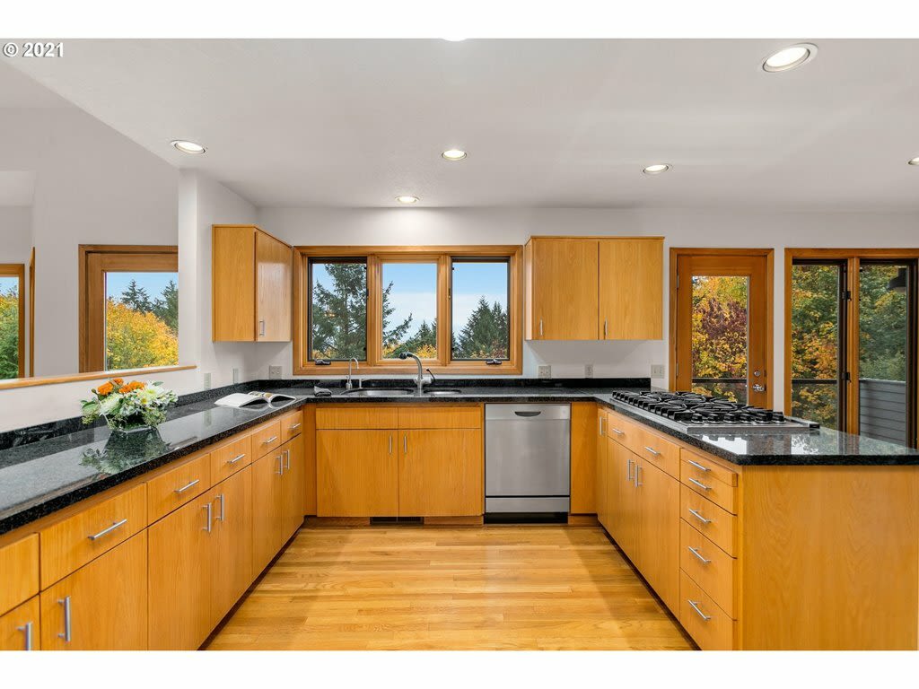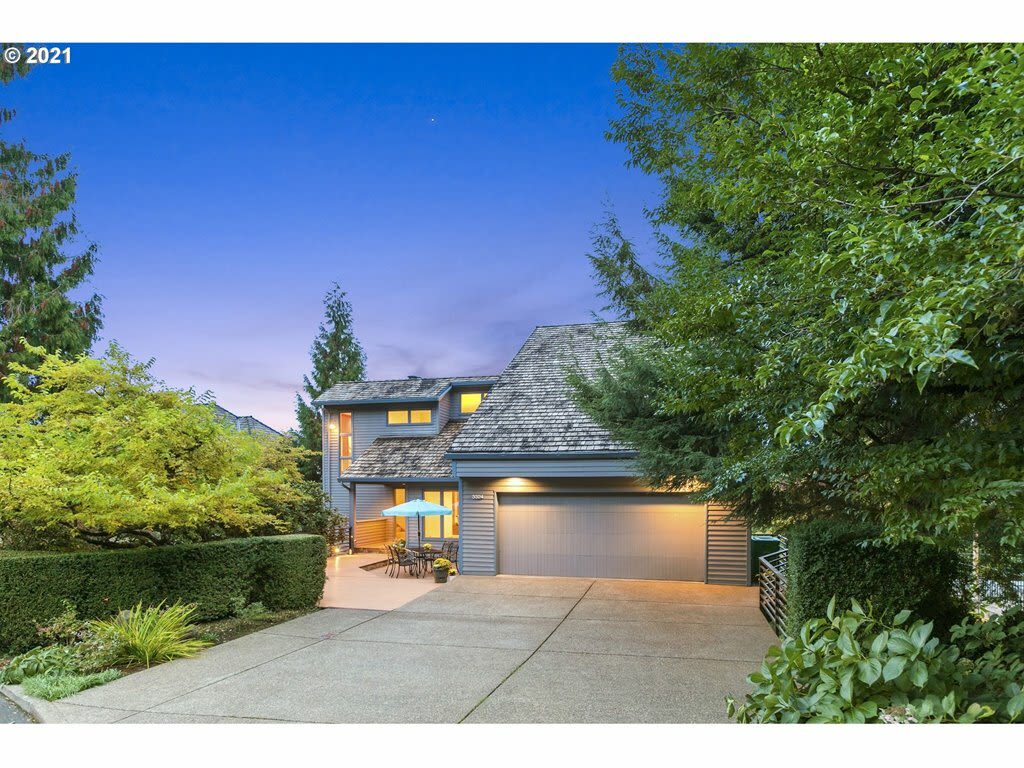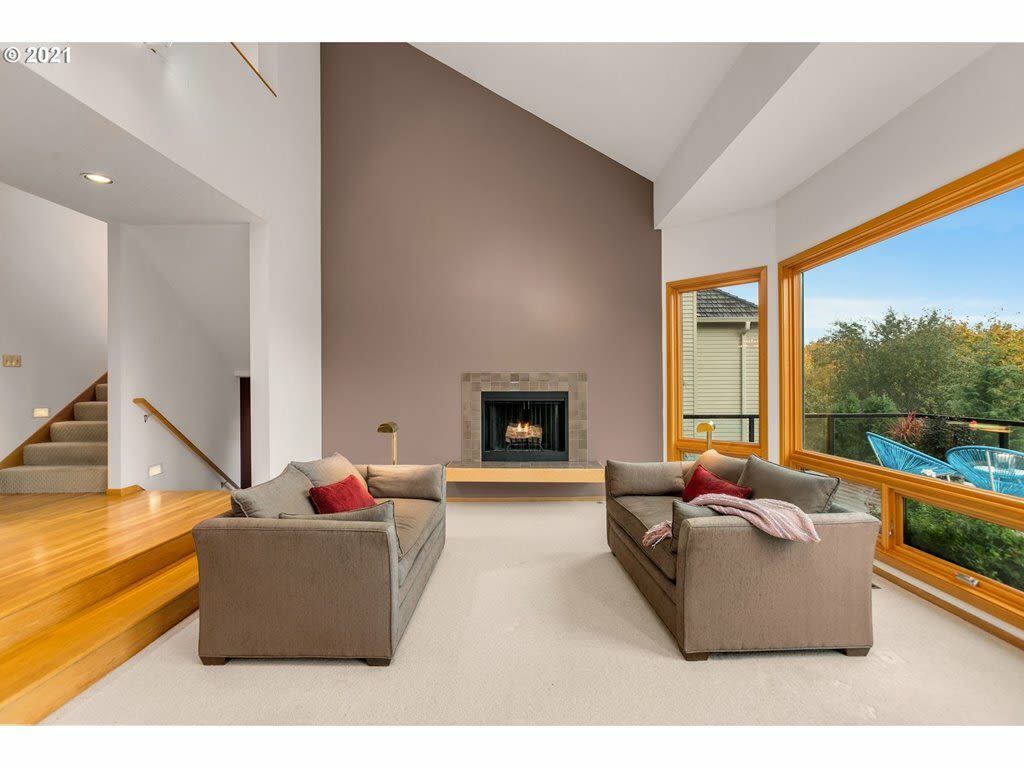 You walk straight into a sunken living room flanked by a stone fireplace, filled with natural light, and has a glass door leading to the large back porch with views overlooking Marquam Nature Park. The kitchen has ample storage and counter space for cooking dinner for family and friends and is right next to a dining space with doors opening to the porch. The master bedroom boasts a large gas fireplace, floor-to-ceiling windows, sliding glass doors, a gorgeous en-suite bathroom, and a massive walk-in closet. On the lower level, you can find a second living area, the second full bathroom, and two bedrooms. In addition to the back deck, there is another large deck located in the front of the house.