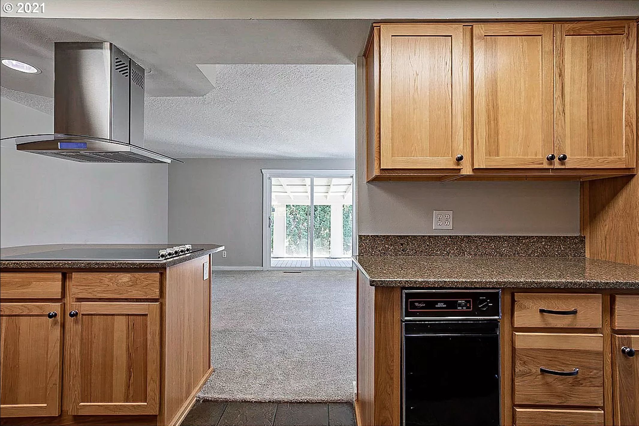 The kitchen in this home overlooks a living room with tons of natural light and a sliding glass door that opens to a spacious sunroom. The kitchen itself is open with lots of counter space, a free-standing island with a cooktop, and a breakfast bar. Down the hall from the living room, dining room and kitchen are the three bedrooms, and two full bathroom. The house has an attached two-car garage with tons of built-in storage and a workspace. In the sunny backyard, there's a porch, garden space, and a fire pit.