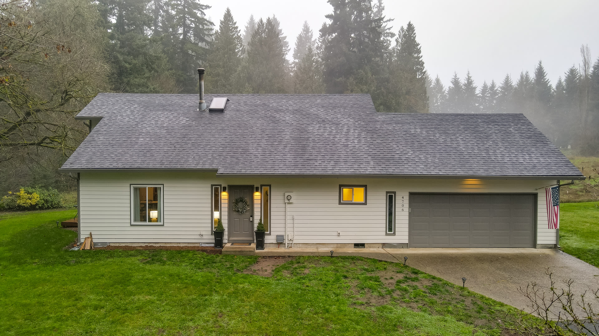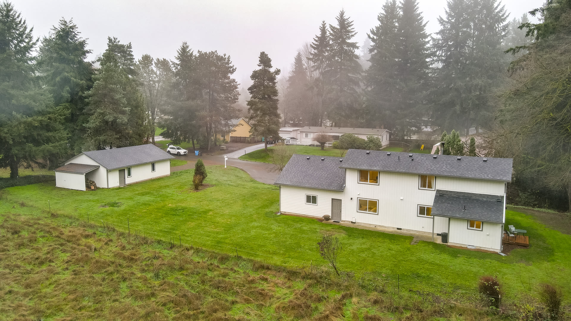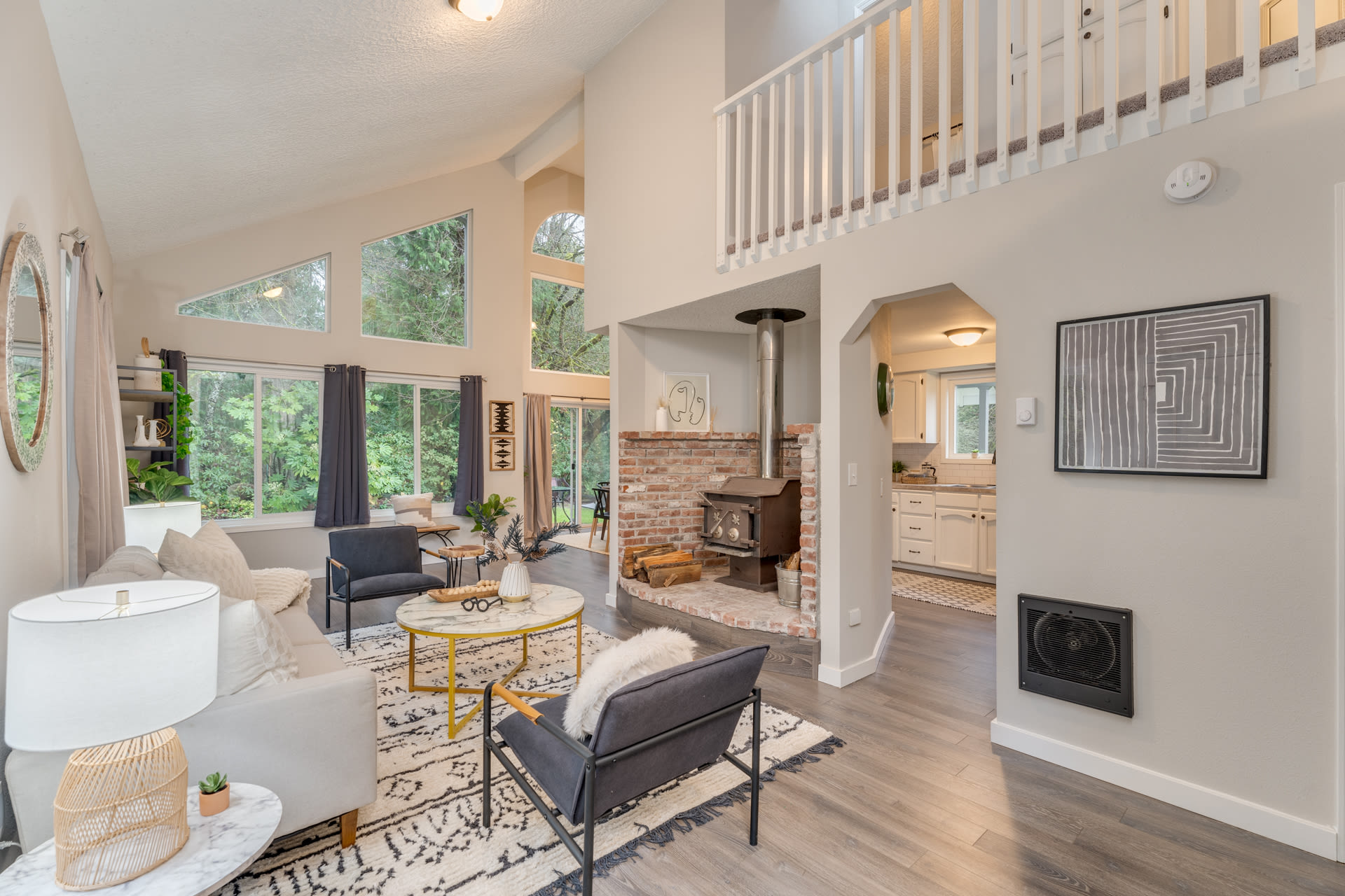 On an acre-plus lot and flush against a quiet green space is this cozy newly renovated house in Vancouver, Washington. You walk directly into the main living space complete with a woodstove and filled with natural light from floor-to-ceiling windows on one wall. The dining area has sliding glass doors that open to the back porch, and is next to the recently updated kitchen with a breakfast bar for two. Also on the main floor you’ll find a spacious master bedroom with a master bathroom fitted with double sinks and a vanity space. The top floor holds the two other bedrooms and final full bathroom. Outside is a large lawn, two attached garage spaces, as well as an 800-square-foot detached garage and work space.