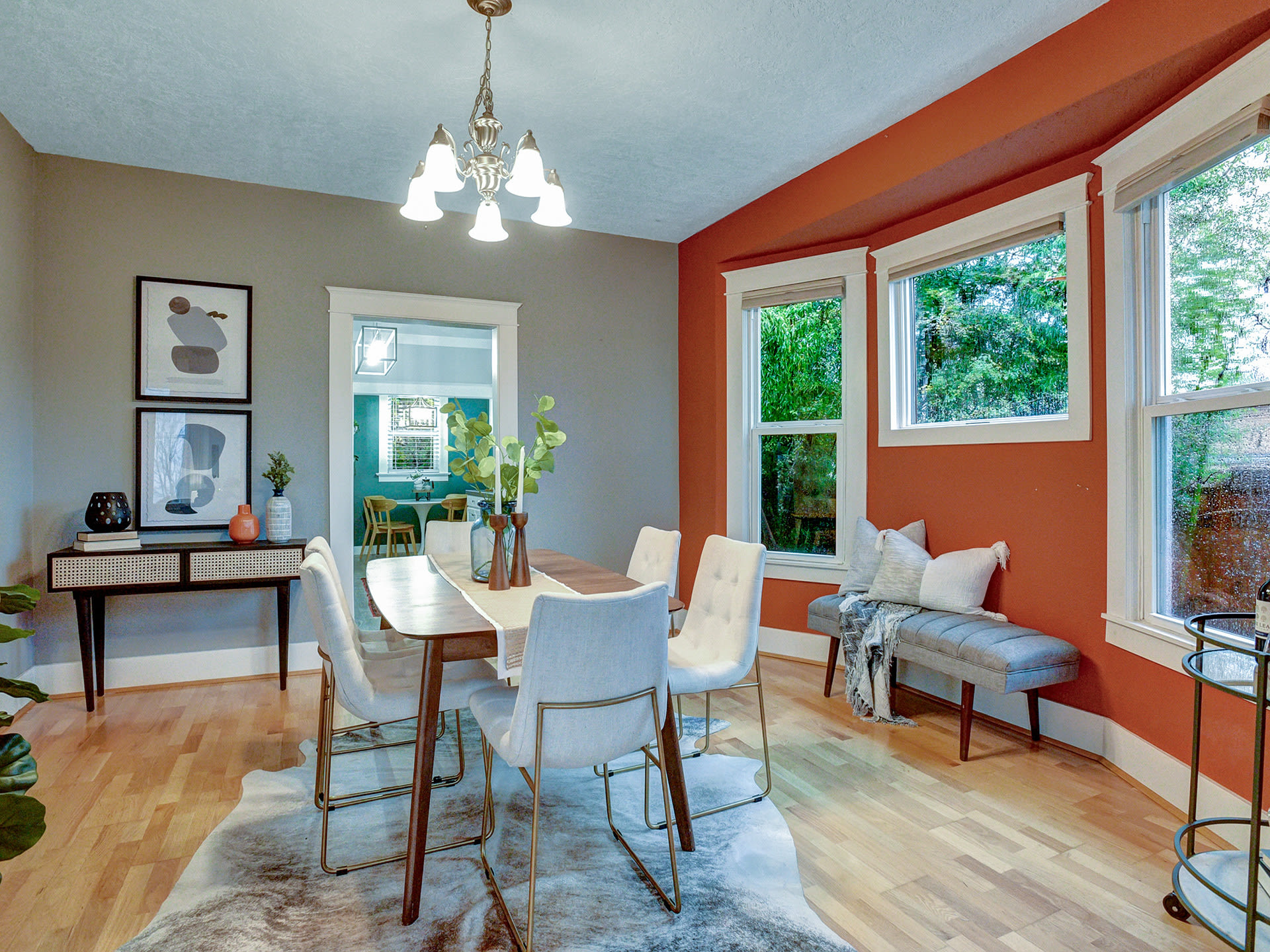 This four-bedroom 1907 bungalow is located in the Mount Tabor neighborhood. You enter directly into the front living room that's filled with light from the large windows. Next to the living space, the formal dining area leads into the recently updated, spacious kitchen complete with a tucked-in eating area. Also on this level you’ll find the first bedroom, as well as the home’s only bathroom. Upstairs boasts two bedrooms, the larger fitted with a walk-in closet with built-in cabinets. The partially finished basement has tons of space to make your own, whether it’s a movie room or just another living space, and also contains a fourth bedroom. Outside, a large deck area is fitted with a stone fireplace, an upper sitting area, a small pond, and a hot tub. The front and back yards are fully fenced, giving pets and kids safety to roam.