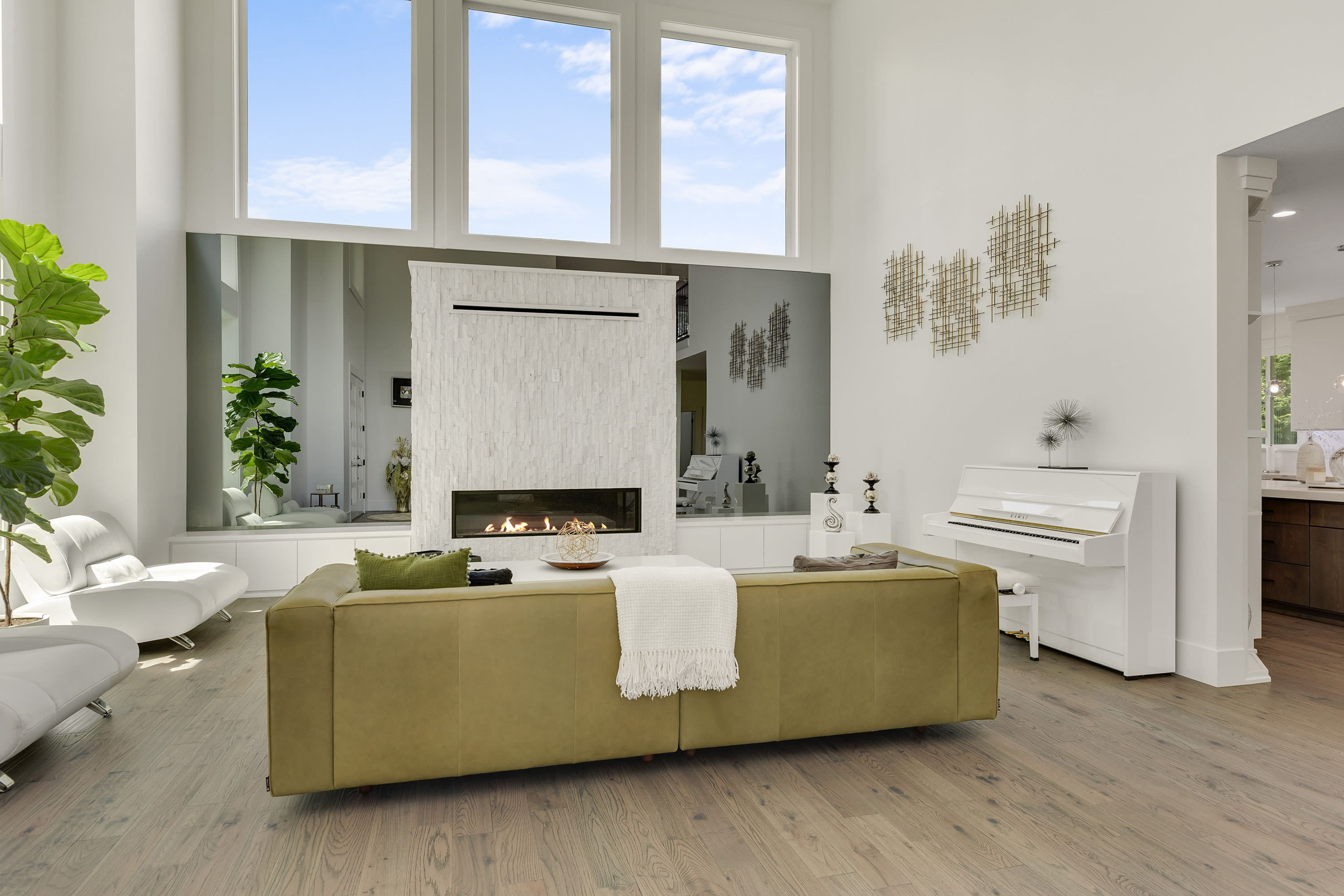 Located on five acres in Battle Ground, Washington, is this truly breathtaking home designed by a Norwegian architect in 2015. When you walk through the front door you are greeted by a bright and open space with a gas fireplace located in the center of the room, separating the front living space from the dining areas. The front living area is surrounded by large windows and tall ceilings. The dining area is surrounded by views of the hills surrounding the property and has glass doors leading to the back porch. The kitchen is complete with wooden cabinets, quartz countertops, and marble backsplash. Past the kitchen is a small office or playroom, the laundry room, a full bathroom, and a mudroom that leads to the covered parking area. Upstairs you’ll first come across a loft space that can be used as a second living space, and three bedrooms. The primary bedroom has a large walk-in closet and an en-suite bathroom. The lower level holds another large living area, the final bathroom, and a large bedroom. Below the back porch is a cement patio with a stone fireplace. The yard is perfect for energetic children with the large grassy area, lightly sloping hills, sandpit, and swing set.