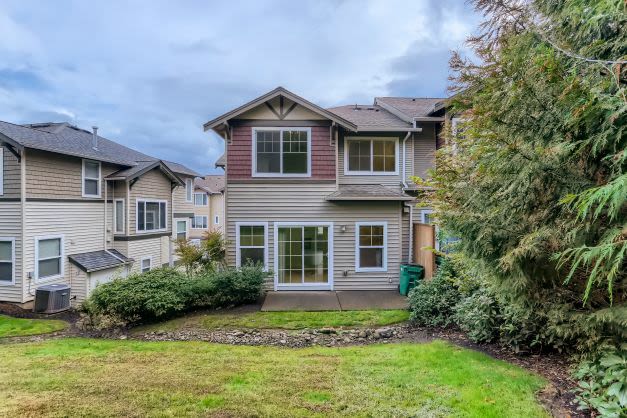 This three-story town house, built in 2006, boasts a balcony, backyard patio, and a large garage space. The garage can fit two cars comfortably, and has an entrance into the main house and access to the half bathroom. The main living area features large windows, a fireplace, and access to the front balcony through sliding glass doors. Also on this level is the kitchen, dining area, and access to the back patio space. The top floor holds the master suite, with an en-suite bathroom and walk in closet, as well as two other bedrooms and another full bathroom.