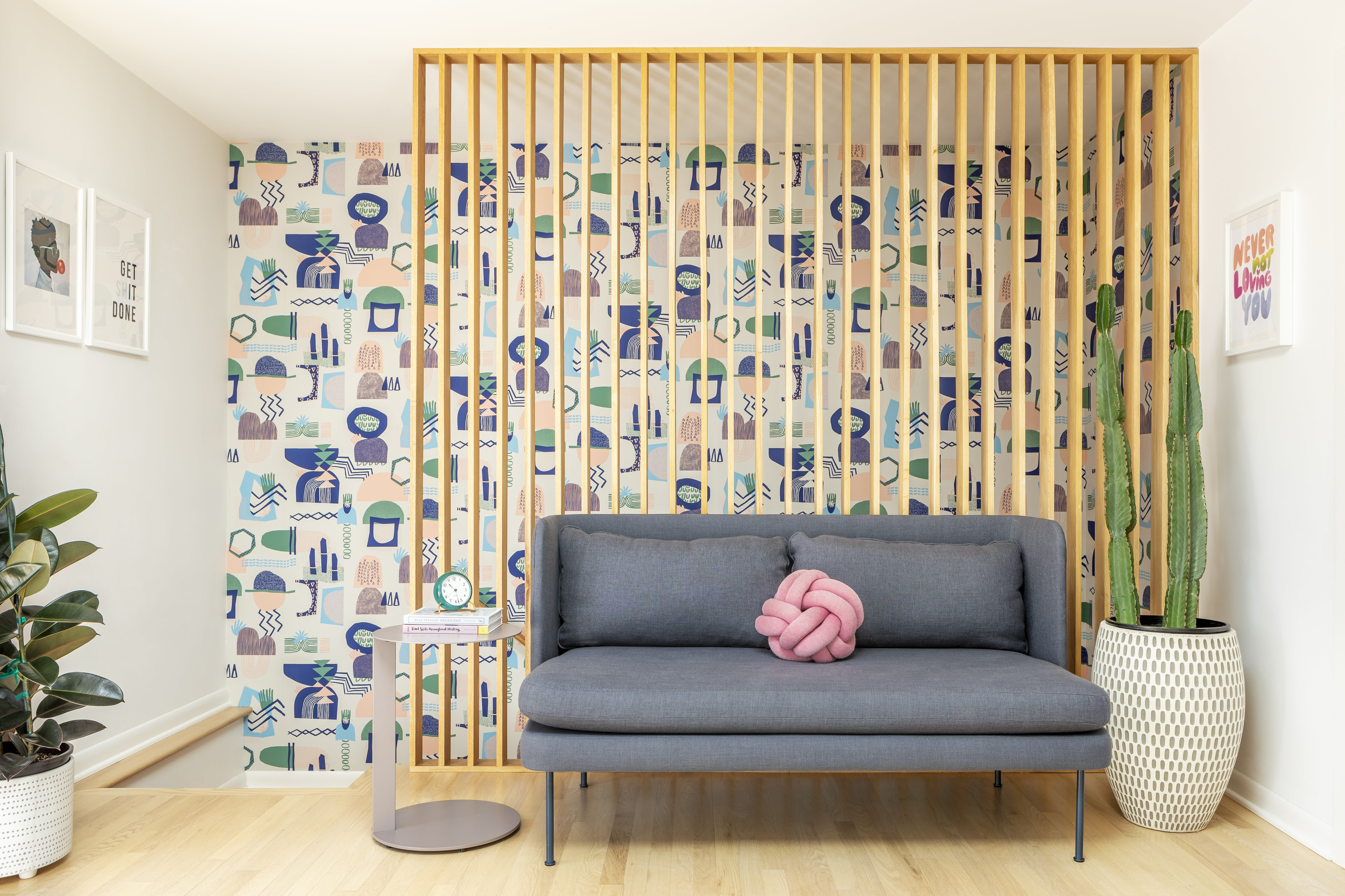 The staircase has a dramatic two-story, 16-foot-tall slat wall that follows the line of the tread, illuminated by a George Nelson Bubble pendant. And, of course, even the downstairs rec room has its own designer spin, as the wood slat wall forms a cozy built-in reading niche with Cole and Son wallpaper and a poppy red Schoolhouse Electric sconce.