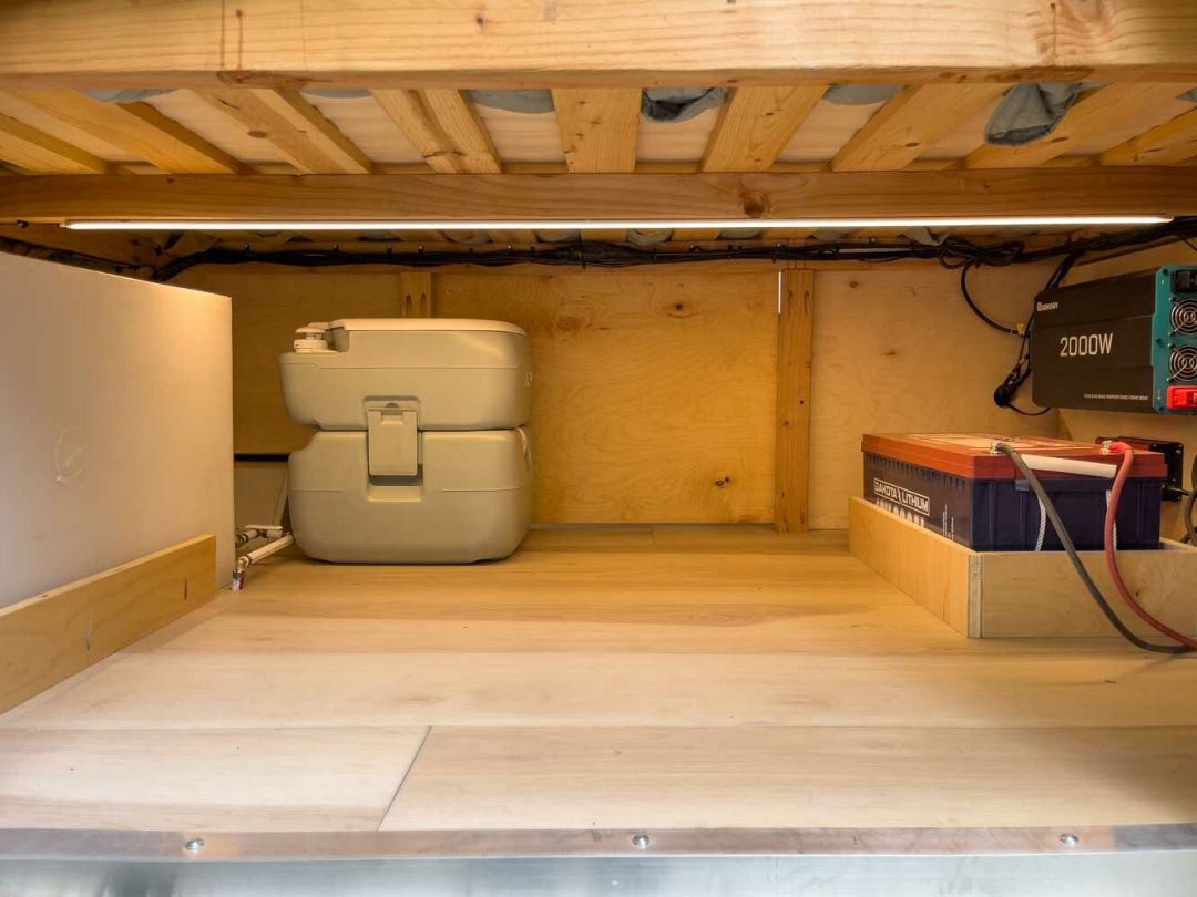 The 126-square-foot interior now has vinyl floors for easy cleaning, and white-painted shiplap covering the ceiling. There’s a three-quarter-size bed at the back, propped up on a storage compartment that can be accessed from the main aisle or from the back door. On one side of the aisle, the kitchenette has a mini-fridge, two-burner stove, and stainless-steel sink, with quite a few soft-close drawers for utensil storage. An open shelf with a lip to keep things in place lines the top of the windows.