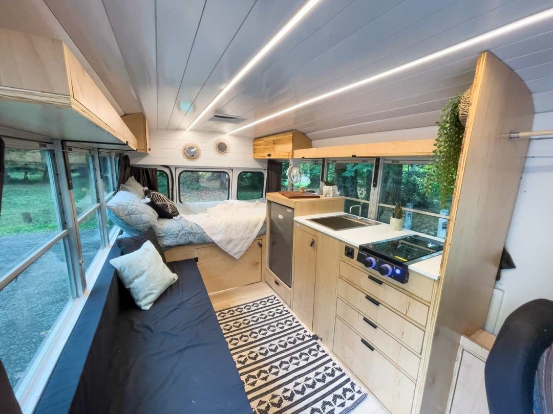 Occasionally, we like to venture out of the Portland market to points beyond, which is how we stumbled on this listing for a custom skoolie from a maker in Eugene. Isaac Turner took up van life in 2017 when he moved into his remodeled Chevy G20. He later discovered the magic of converting retired school buses into mobile tiny homes—called “skoolies” for the uninitiated—via his shop, Dream Reality Studios, which produces 2-3 skoolies per year. His latest project is the “Minion,” a former high school activities bus that’s been outfitted with a suite of modern maple cabinetry, a kitchenette, and a bed and couch to sleep three.