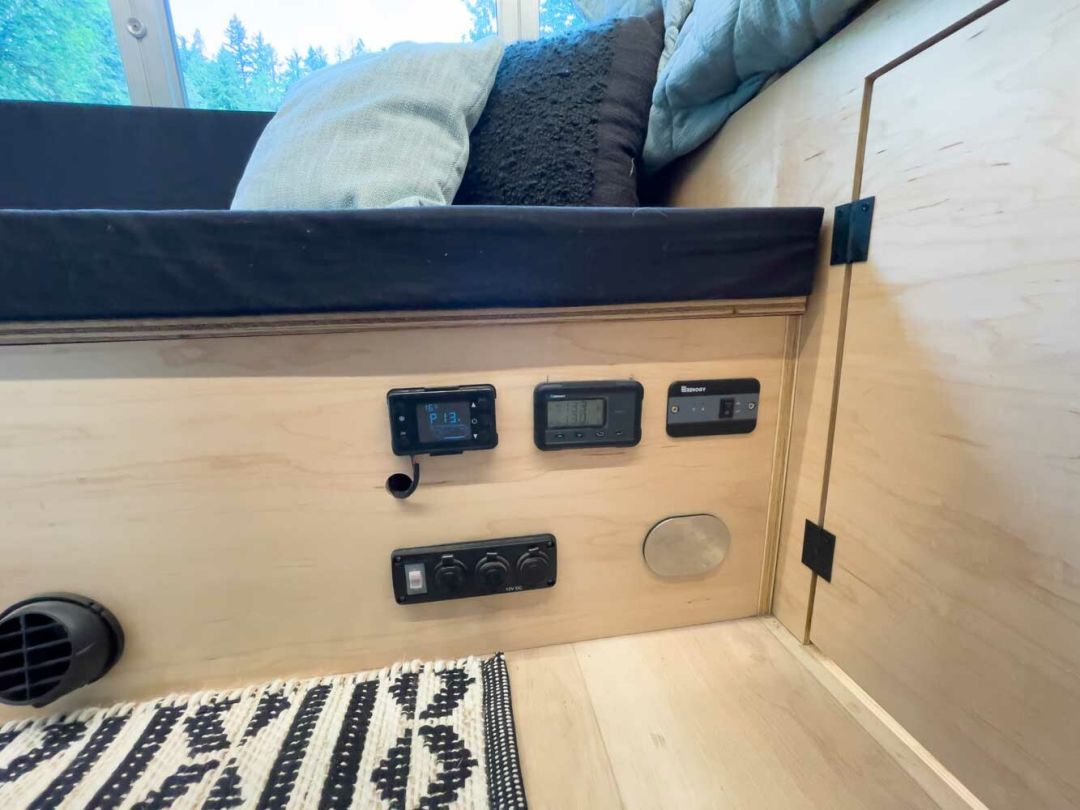 The opposite wall has a built-in couch with more interior storage, the electrical system display, and an upholstered surface wide enough to sleep a third person. A floating side table at the end, to set plate or prop a laptop, is a convenient touch, as are the USB ports and three 110-volt outlets. As for necessities, the listing includes a camp toilet that can slide out from the under-the-bed storage hatch, and blackout curtains for privacy. So, who’s ready to hit the road?