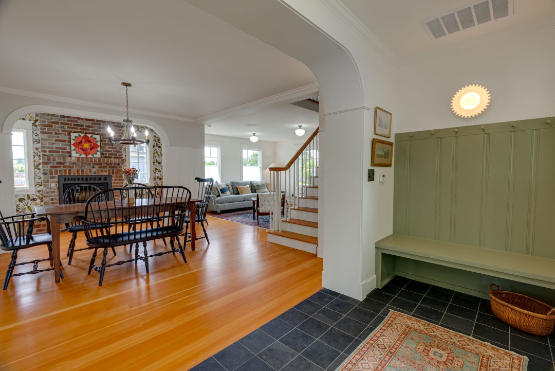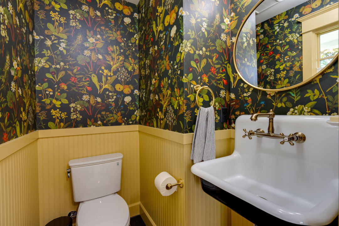 Inside, the home is all about those charming historic details, like cased arched doorways, crown molding, and refurbished wood paneling, paired with hits of pattern and play via wallpaper and tile. This starts in the foyer, with its slate floors and built-in bench, and there's a powder room wrapped in mustard-colored wainscot and black floral wallpaper.