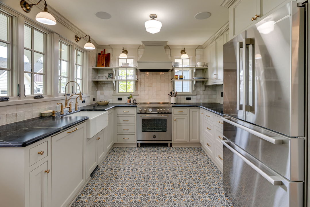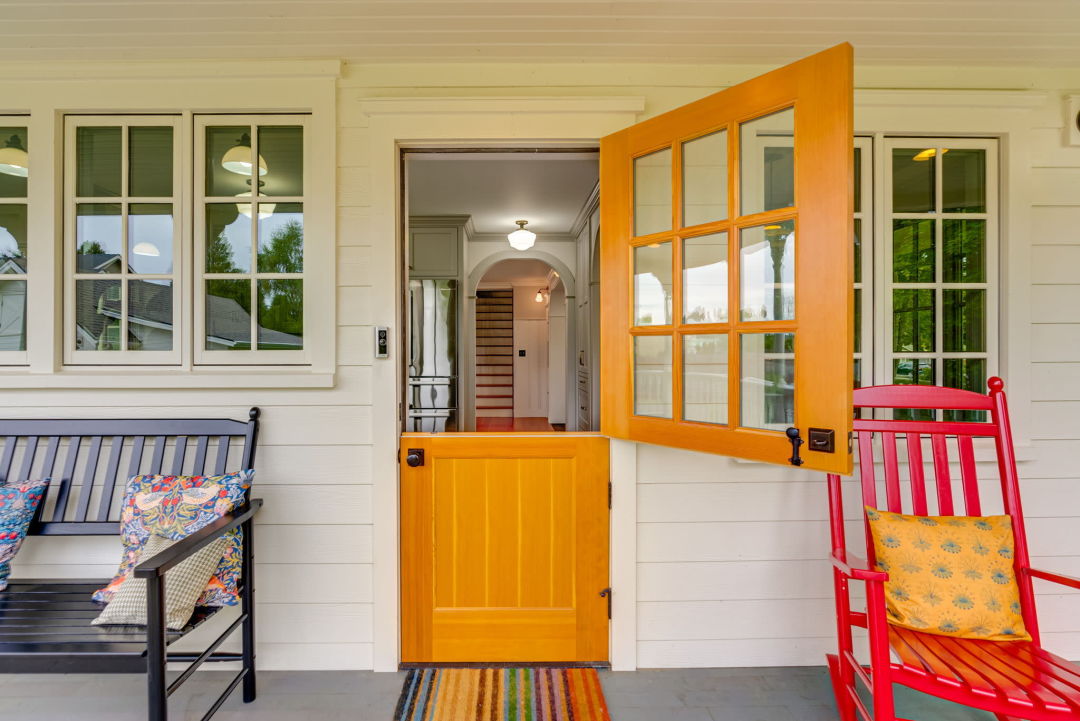 The kitchen is another standout, thanks to custom inset cabinets accented with brass hardware and a Zellige tile backsplash, high-end appliances like a Bertazzoni range, a pretty tiled floor, and a bespoke built-in eating nook. A Dutch door—so fitting—connects you back to the porch and a nearby herb garden.