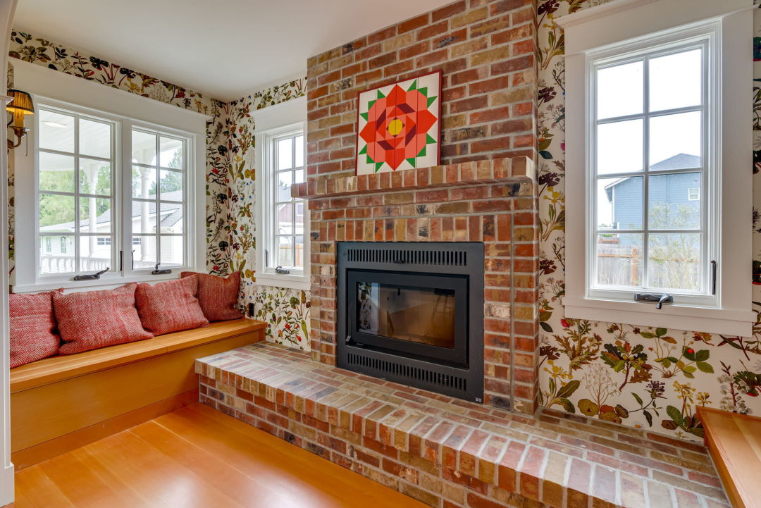 The main living spaces are connected by those aforementioned cased archways, with the focal point being an inglenook. There, a high-efficiency woodstove is flanked by built-in fir benches and a House of Hackney wallpaper that picks up on the colors of the brick hearth.