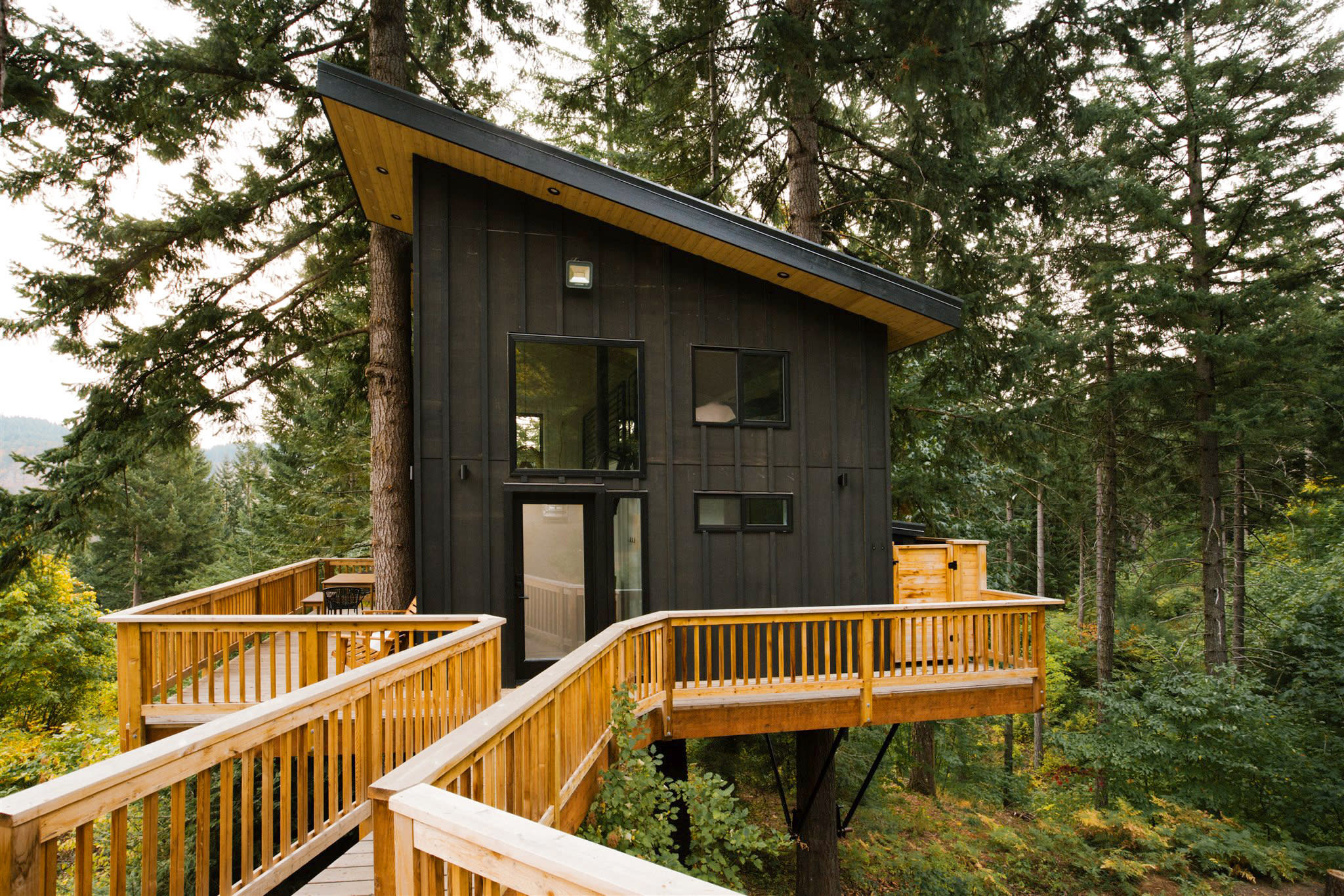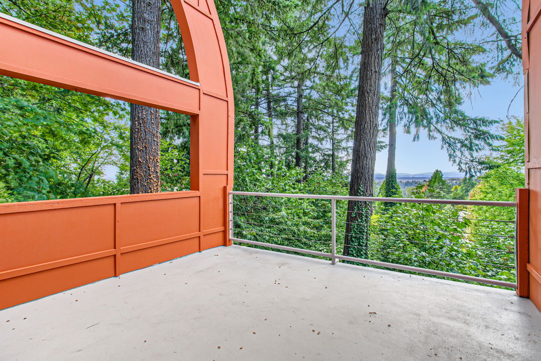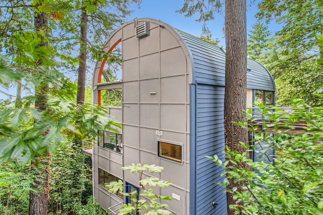 Tucked into the woods at the northernmost point of the Hillsdale neighborhood—but just visible enough to elicit double takes from passersby on SW Dosch Road—this curved metal home invites a host of comparisons. The Oregonian lists it among the state’s moon-shaped dwellings, and also likens it to a planetarium. The view from any one of its elevated decks calls a treehouse to mind. One Redditor who grew up nearby knows it, with the blunt precision of childhood, as the Mailbox House.